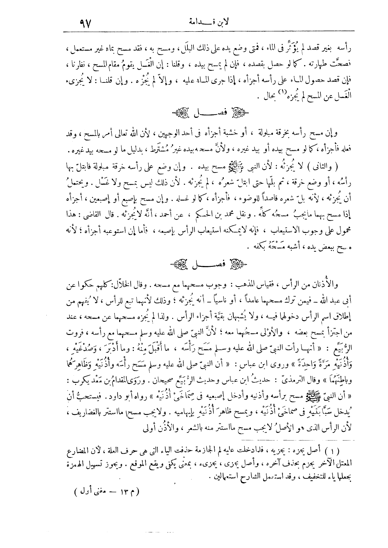 (١٧٤) فَصْلٌ: وَالْأُذُنَانِ مِنْ الرَّأْسِ، فَقِيَاسُ الْمَذْهَبِ وُجُوبُ مَسْحِهِمَا مَعَ مَسْحِهِ. وَقَالَ الْخَلَّالُ كُلُّهُمْ حَكَوْا عَنْ أَبِي عَبْدِ اللَّهِ فِيمَنْ تَرَكَ مَسْحَهُمَا عَامِدًا أَوْ نَاسِيًا، أَنَّهُ يُجْزِئُهُ؛ وَذَلِكَ لِأَنَّهُمَا تَبَعٌ لِلرَّأْسِ، لَا يُفْهَمُ مِنْ إطْلَاقِ اسْمِ الرَّأْسِ دُخُولُهُمَا فِيهِ، وَلَا يُشْبِهَانِ بَقِيَّةَ أَجْزَاءِ الرَّأْسِ، وَلِذَلِكَ لَمْ يُجْزِهِ مَسْحُهُمَا عَنْ مَسْحِهِ عِنْدَ مَنْ اجْتَزَأَ بِمَسْحِ بَعْضِهِ، وَالْأَوْلَى مَسْحُهُمَا مَعَهُ؛ لِأَنَّ النَّبِيَّ - صَلَّى اللَّهُ عَلَيْهِ وَسَلَّمَ - مَسَحَهُمَا مَعَ رَأْسِهِ، فَرَوَتْ «الرُّبَيِّعُ، أَنَّهَا رَأَتْ النَّبِيَّ - صَلَّى اللَّهُ عَلَيْهِ وَسَلَّمَ - مَسَحَ رَأْسَهُ، مَا أَقْبَلَ مِنْهُ وَمَا أَدْبَرَ وَصُدْغَيْهِ وَأُذُنَيْهِ مَرَّةً وَاحِدَةً» .