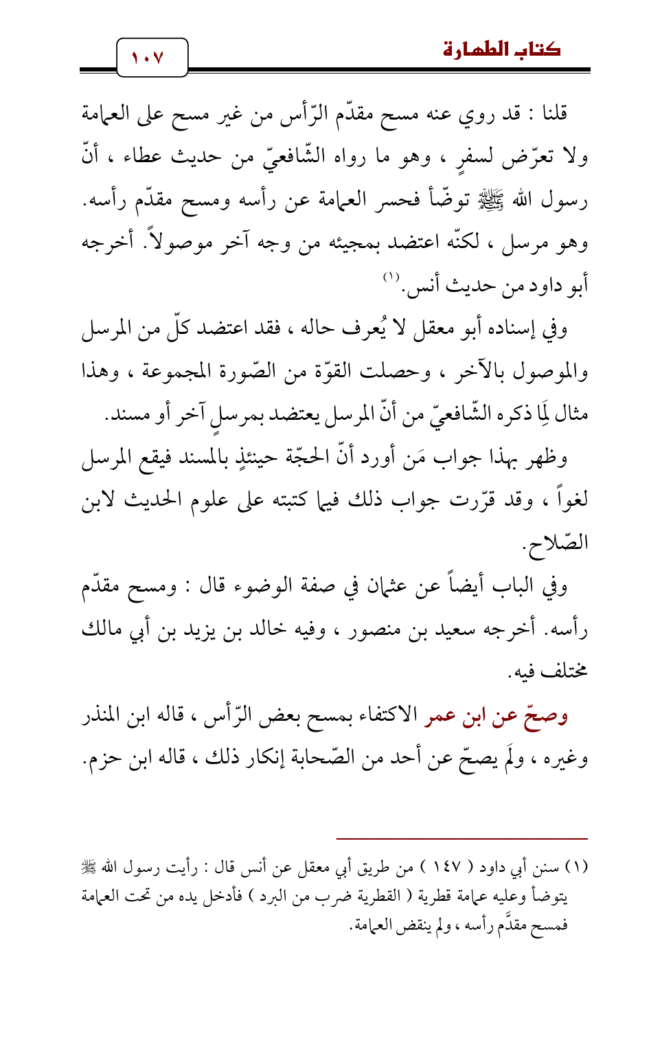 (¬1) سنن أبي داود (147) من طريق أبي معقل عن أنس قال: رأيت رسول الله - صلى الله عليه وسلم - يتوضأ وعليه عمامة قطرية (القطرية ضرب من البرد) فأدخل يده من تحت العمامة فمسح مقدَّم رأسه , ولم ينقض العمامة.