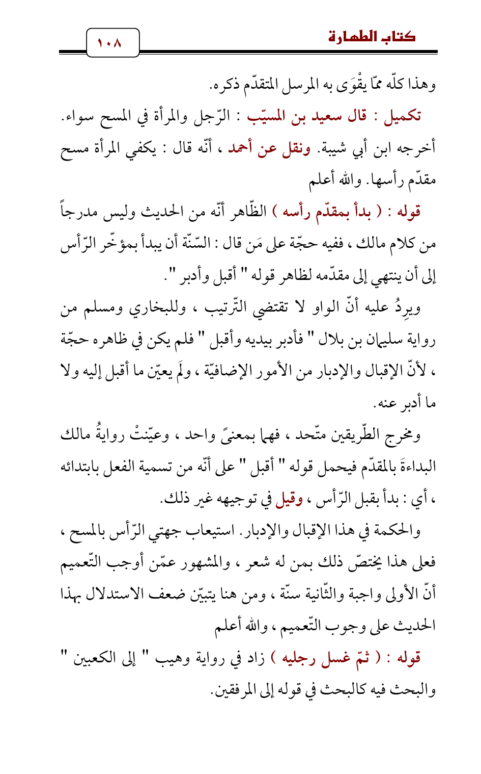 تكميل: قال سعيد بن المسيّب: الرّجل والمرأة في المسح سواء. أخرجه ابن أبي شيبة. ونقل عن أحمد , أنّه قال: يكفي المرأة مسح مقدّم رأسها. والله أعلم