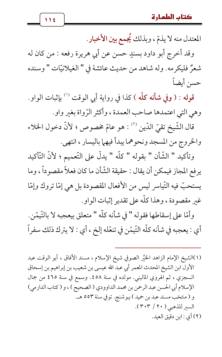 وتأكيد " الشّأن " بقوله " كلّه " يدلّ على التّعميم؛ لأنّ التّأكيد يرفع المجاز فيمكن أن يقال: حقيقة الشّأن ما كان فعلاً مقصوداً، وما يستحبّ فيه التّياسر ليس من الأفعال المقصودة بل هي إمّا تروك وإمّا غير مقصودة، وهذا كلّه على تقدير إثبات الواو.