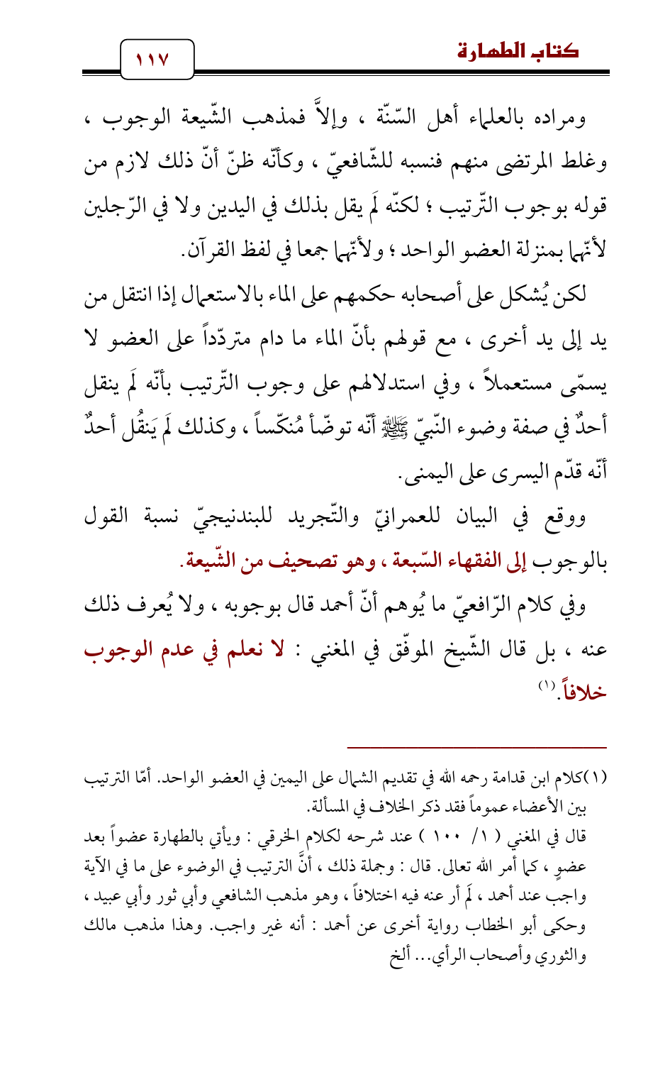 (¬1) كلام ابن قدامة رحمه الله في تقديم الشمال على اليمين في العضو الواحد. أمّا الترتيب بين الأعضاء عموماً فقد ذكر الخلاف في المسألة.