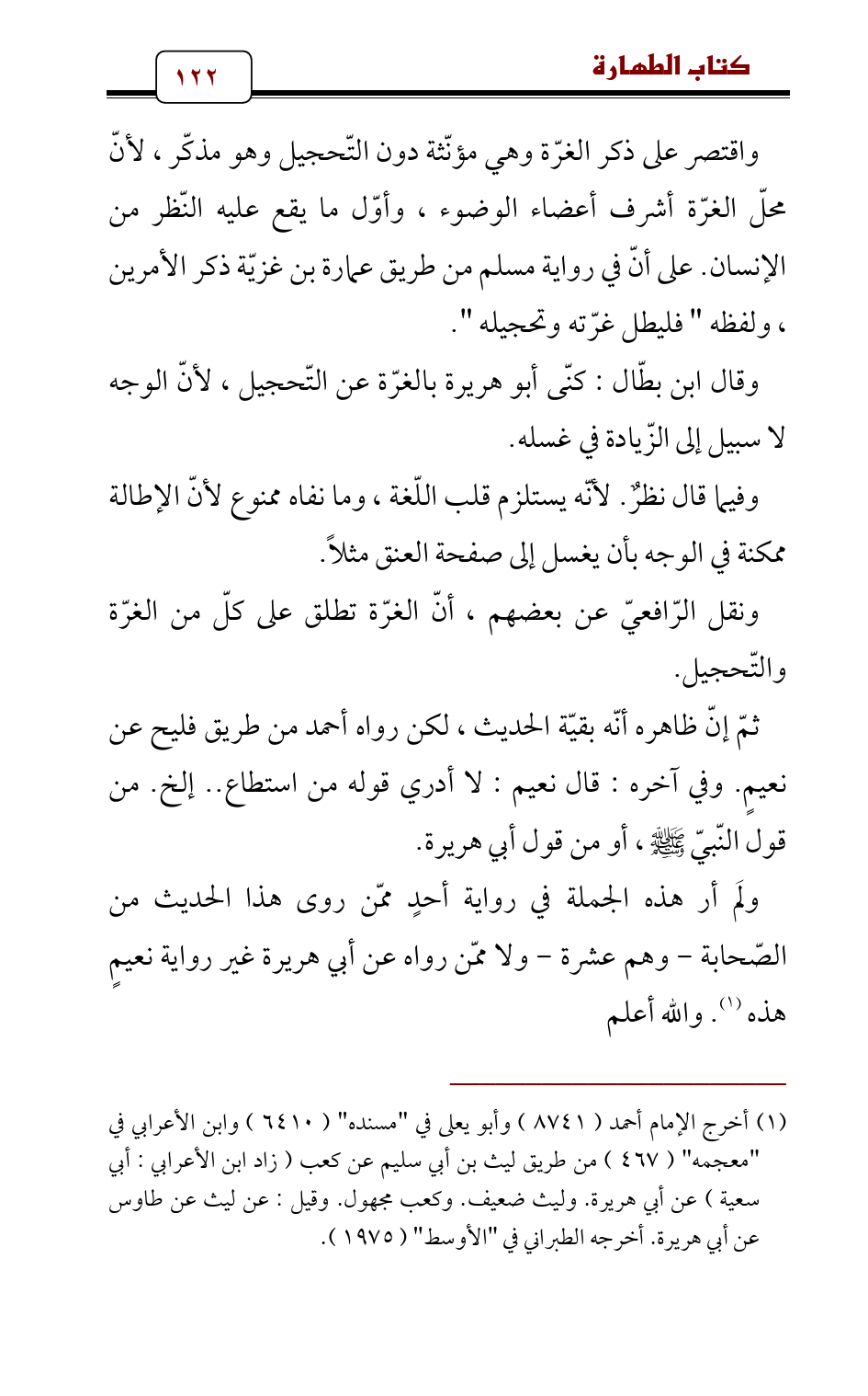 وقال ابن بطّال: كنّى أبو هريرة بالغرّة عن التّحجيل , لأنّ الوجه لا سبيل إلى الزّيادة في غسله.