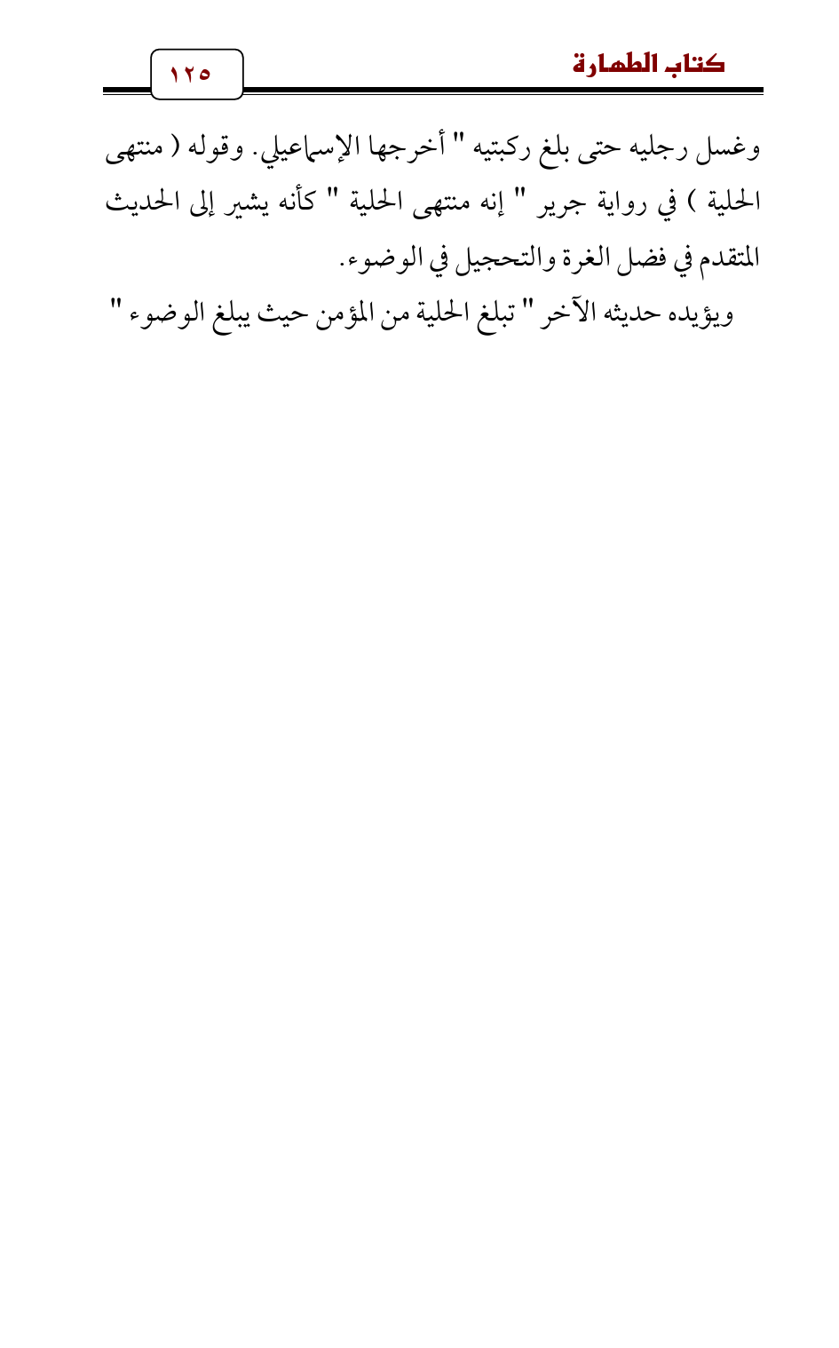 وغسل رجليه حتى بلغ ركبتيه " أخرجها الإسماعيلي. وقوله (منتهى الحلية) في رواية جرير " إنه منتهى الحلية " كأنه يشير إلى الحديث المتقدم في فضل الغرة والتحجيل في الوضوء.