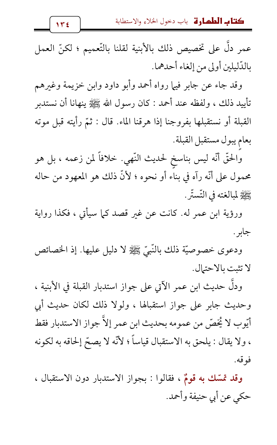 ودلَّ حديث ابن عمر الآتي على جواز استدبار القبلة في الأبنية، وحديث جابر على جواز استقبالها، ولولا ذلك لكان حديث أبي أيّوب لا يُخصّ من عمومه بحديث ابن عمر إلاَّ جواز الاستدبار فقط، ولا يقال: يلحق به الاستقبال قياساً؛ لأنّه لا يصحّ إلحاقه به لكونه فوقه.