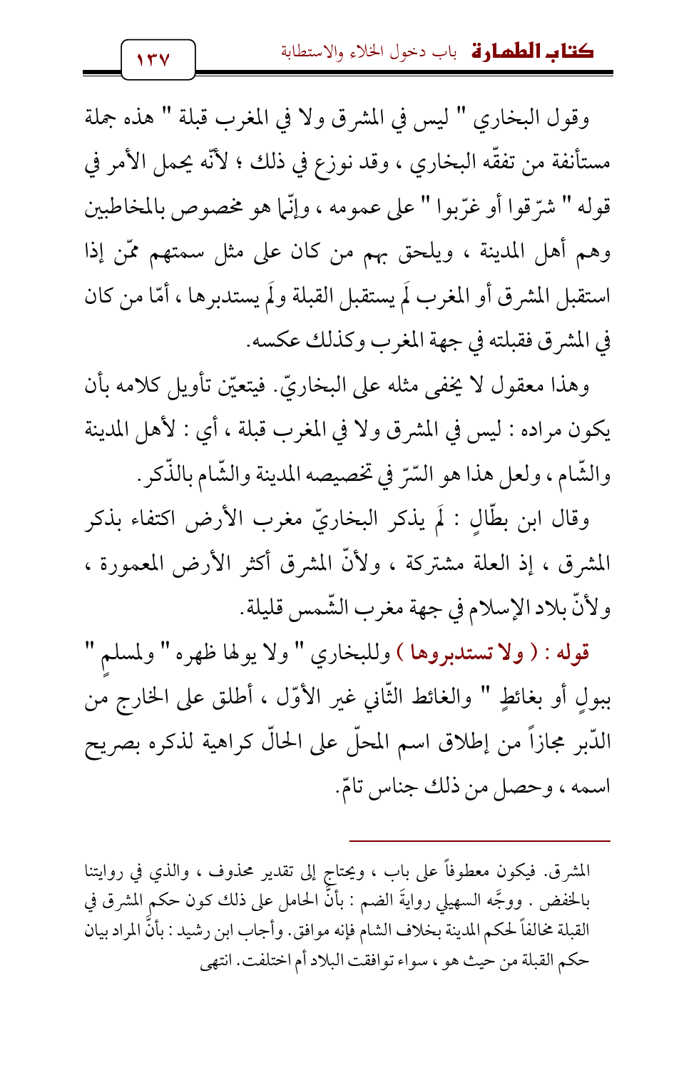 وقول البخاري " ليس في المشرق ولا في المغرب قبلة " هذه جملة مستأنفة من تفقّه البخاري، وقد نوزع في ذلك؛ لأنّه يحمل الأمر في قوله " شرّقوا أو غرّبوا " على عمومه، وإنّما هو مخصوص بالمخاطبين وهم أهل المدينة، ويلحق بهم من كان على مثل سمتهم ممّن إذا استقبل المشرق أو المغرب لَم يستقبل القبلة ولَم يستدبرها، أمّا من كان في المشرق فقبلته في جهة المغرب وكذلك عكسه.