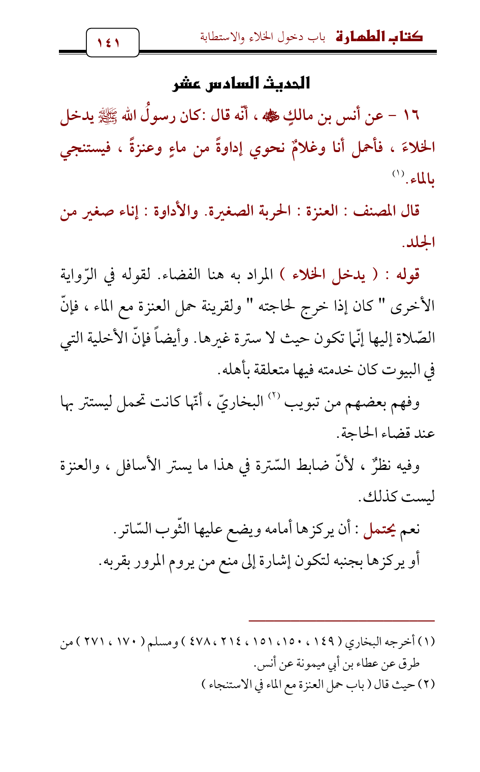 16 - عن أنس بن مالكٍ - رضي الله عنه - , أنّه قال: كان رسولُ الله - صلى الله عليه وسلم - يدخل الخلاءَ , فأحمل أنا وغلامٌ نحوي إداوةً من ماءٍ وعنزةً , فيستنجي بالماء. (¬1)