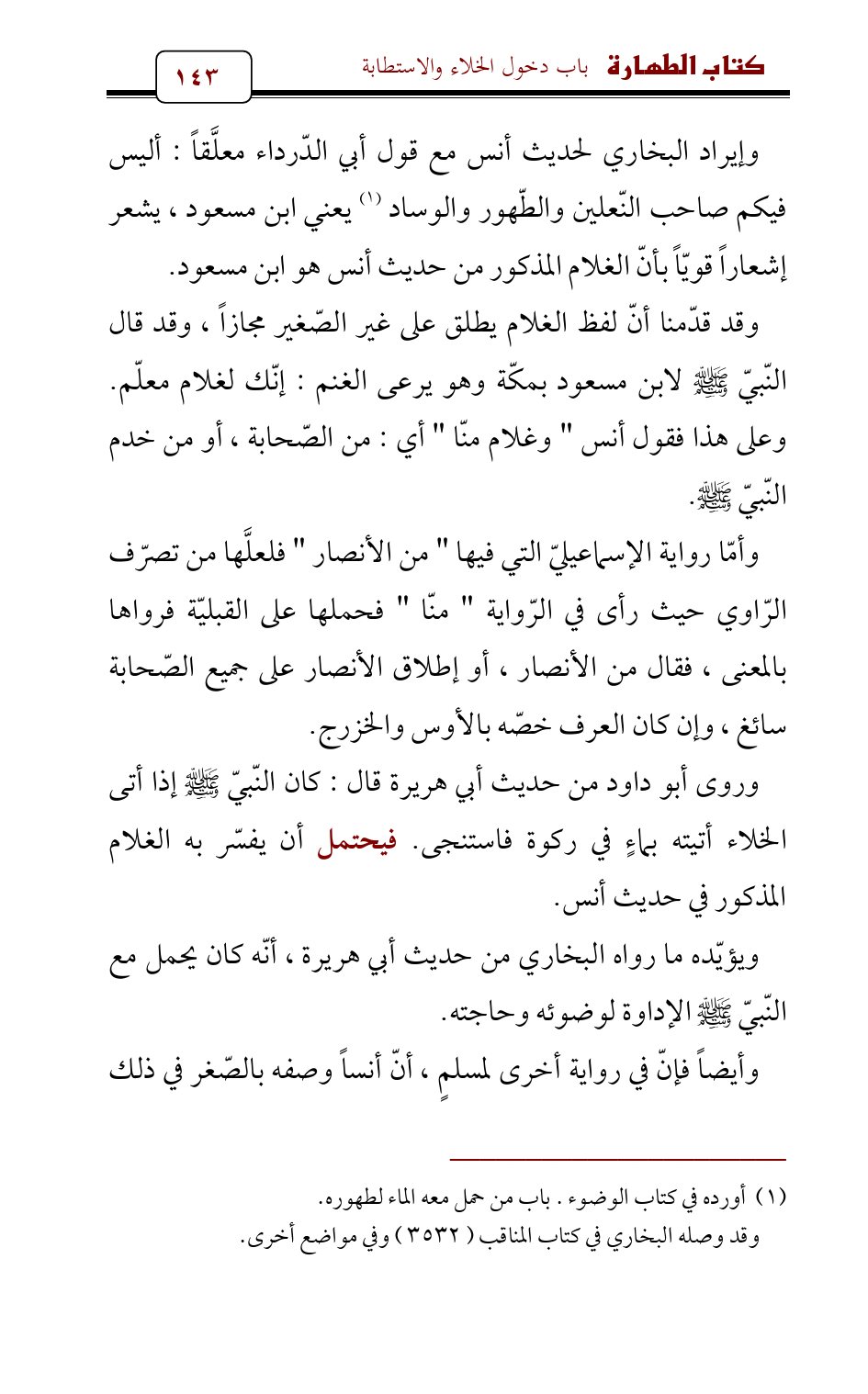 وإيراد البخاري لحديث أنس مع قول أبي الدّرداء معلَّقاً: أليس فيكم صاحب النّعلين والطّهور والوساد (¬1) يعني ابن مسعود , يشعر إشعاراً قويّاً بأنّ الغلام المذكور من حديث أنس هو ابن مسعود.