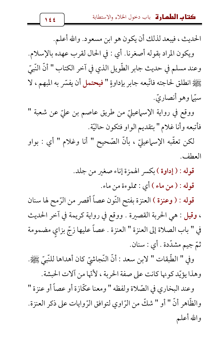 وعند البخاري في الصّلاة ولفظه " ومعنا عكّازة أو عصاً أو عنزة " والظّاهر أنّ " أو " شكّ من الرّاوي لتوافق الرّوايات على ذكر العنزة. والله أعلم