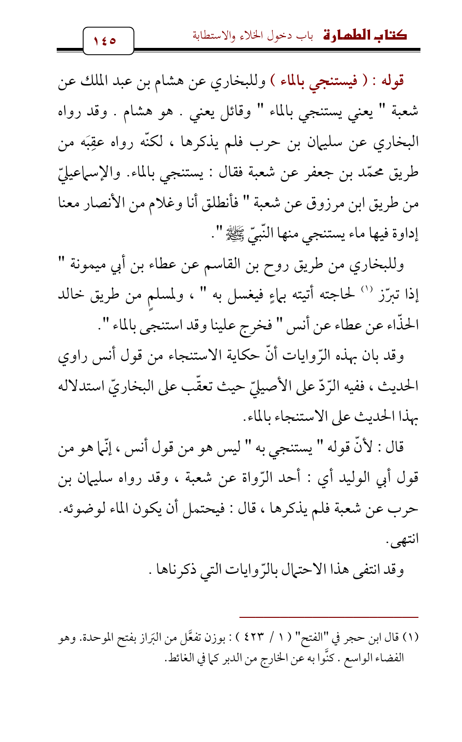قال: لأنّ قوله " يستنجي به " ليس هو من قول أنس , إنّما هو من قول أبي الوليد أي: أحد الرّواة عن شعبة، وقد رواه سليمان بن حرب عن شعبة فلم يذكرها، قال: فيحتمل أن يكون الماء لوضوئه. انتهى.