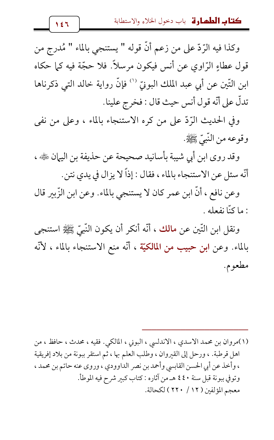 ونقل ابن التّين عن مالك , أنّه أنكر أن يكون النّبيّ - صلى الله عليه وسلم - استنجى بالماء. وعن ابن حبيب من المالكيّة , أنّه منع الاستنجاء بالماء , لأنّه مطعوم.