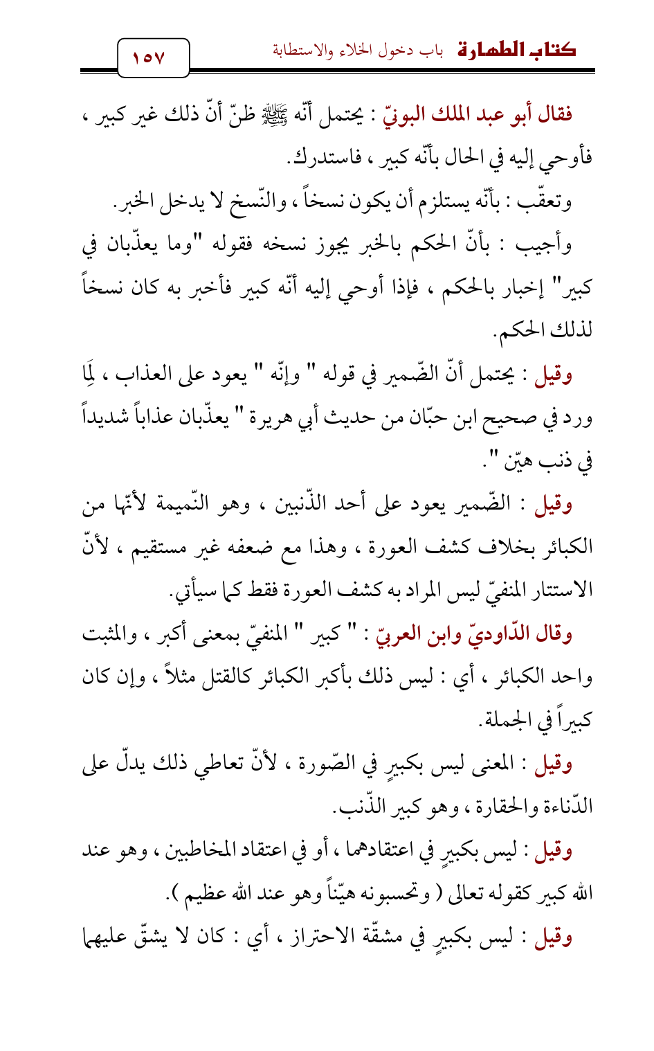 فقال أبو عبد الملك البونيّ: يحتمل أنّه - صلى الله عليه وسلم - ظنّ أنّ ذلك غير كبير، فأوحي إليه في الحال بأنّه كبير، فاستدرك.