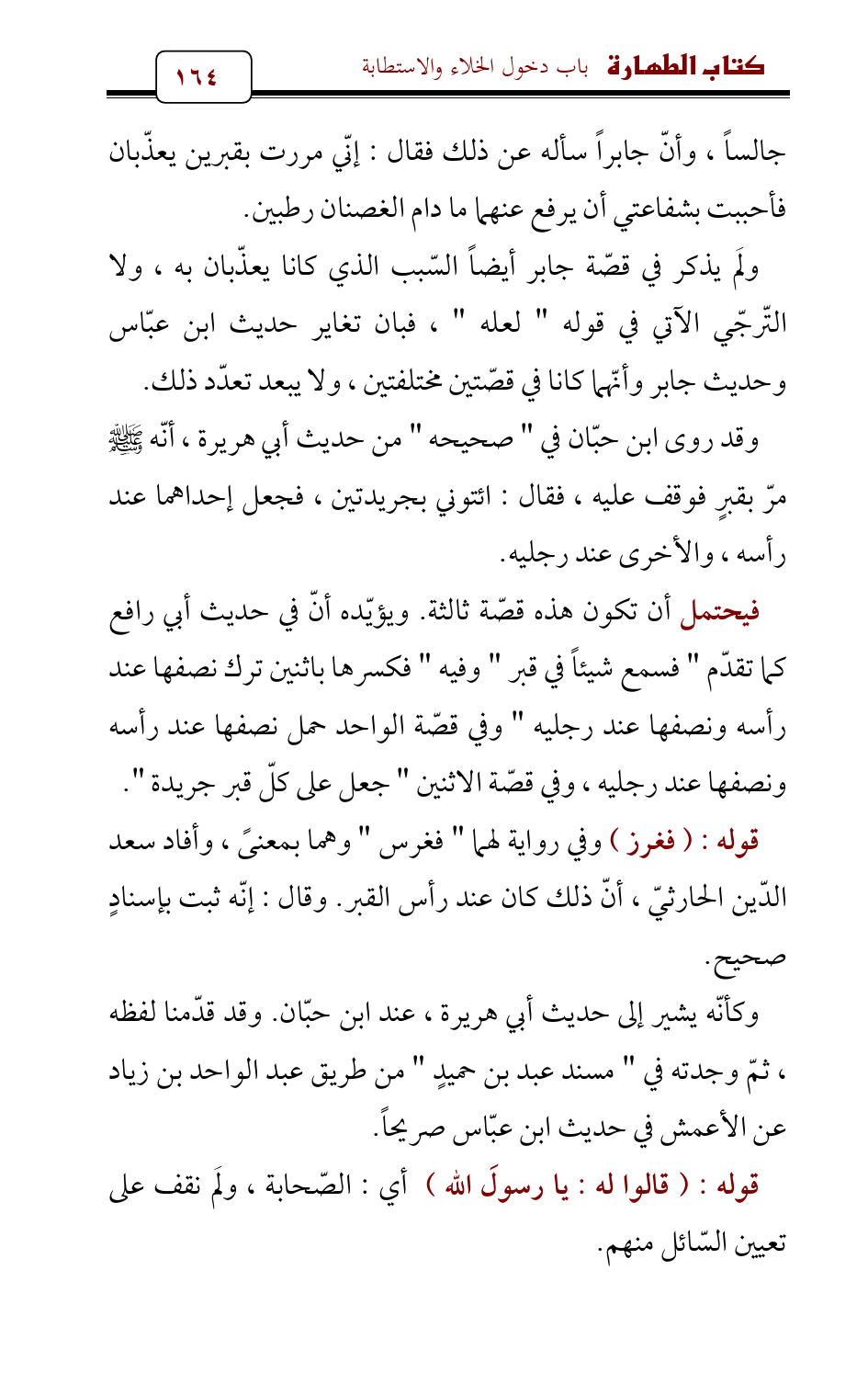 ولَم يذكر في قصّة جابر أيضاً السّبب الذي كانا يعذّبان به، ولا التّرجّي الآتي في قوله " لعله "، فبان تغاير حديث ابن عبّاس وحديث جابر وأنّهما كانا في قصّتين مختلفتين، ولا يبعد تعدّد ذلك.