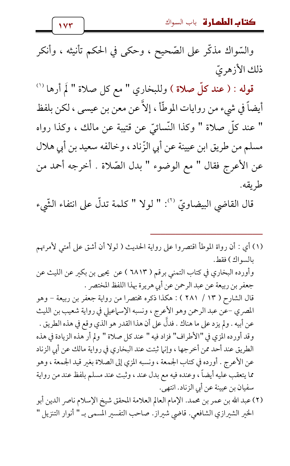 وقد أورده المزي في " الأطراف " فزاد فيه " عند كل صلاة " ولم أر هذه الزيادة في هذه الطريق عند أحد ممن أخرجها , وإنما ثبتت عند البخاري في رواية مالك عن أبي الزناد عن الأعرج. أورده في كتاب الجمعة , ونسبه المزي إلى الصلاة بغير قيد الجمعة , وهو مما يتعقب عليه أيضاً , وعنده فيه مع بدل عند , وثبت عند مسلم بلفظ عند من رواية سفيان بن عيينة عن أبي الزناد. انتهى.