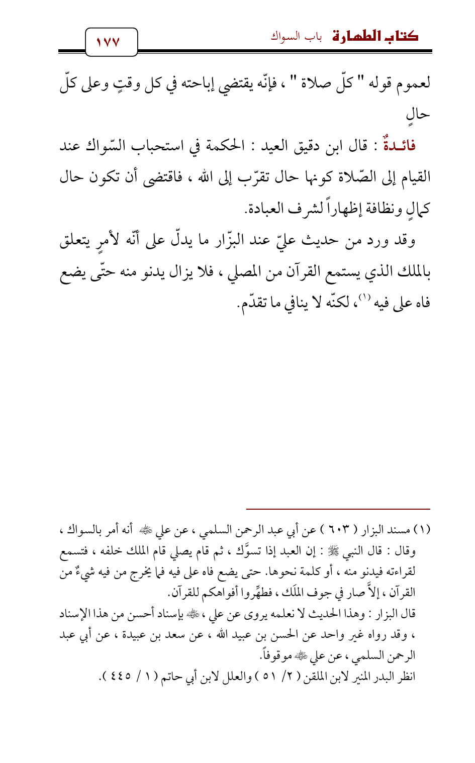 (¬1) مسند البزار (603) عن أبي عبد الرحمن السلمي، عن علي - رضي الله عنه - أنه أمر بالسواك، وقال: قال النبي - صلى الله عليه وسلم -: إن العبد إذا تسوَّك، ثم قام يصلي قام الملك خلفه، فتسمع لقراءته فيدنو منه , أو كلمة نحوها. حتى يضع فاه على فيه فما يخرج من فيه شيءٌ من القرآن، إلاَّ صار في جوف الملَك، فطهِّروا أفواهكم للقرآن.