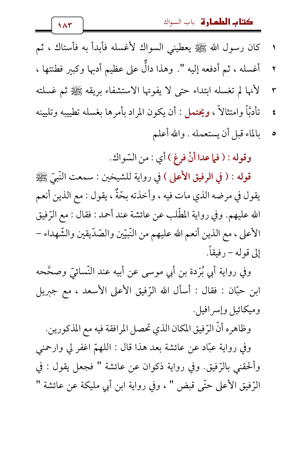 كان رسول الله - صلى الله عليه وسلم - يعطيني السواك لأغسله فأبدأ به فأستاك , ثم أغسله , ثم أدفعه إليه ". وهذا دالٌّ على عظيم أدبها وكبير فطنتها , لأنها لم تغسله ابتداء حتى لا يفوتها الاستشفاء بريقه - صلى الله عليه وسلم - ثم غسلته تأدبَّاً وامتثالاً , ويحتمل: أن يكون المراد بأمرها بغسله تطييبه وتليينه بالماء قبل أن يستعمله. والله أعلم