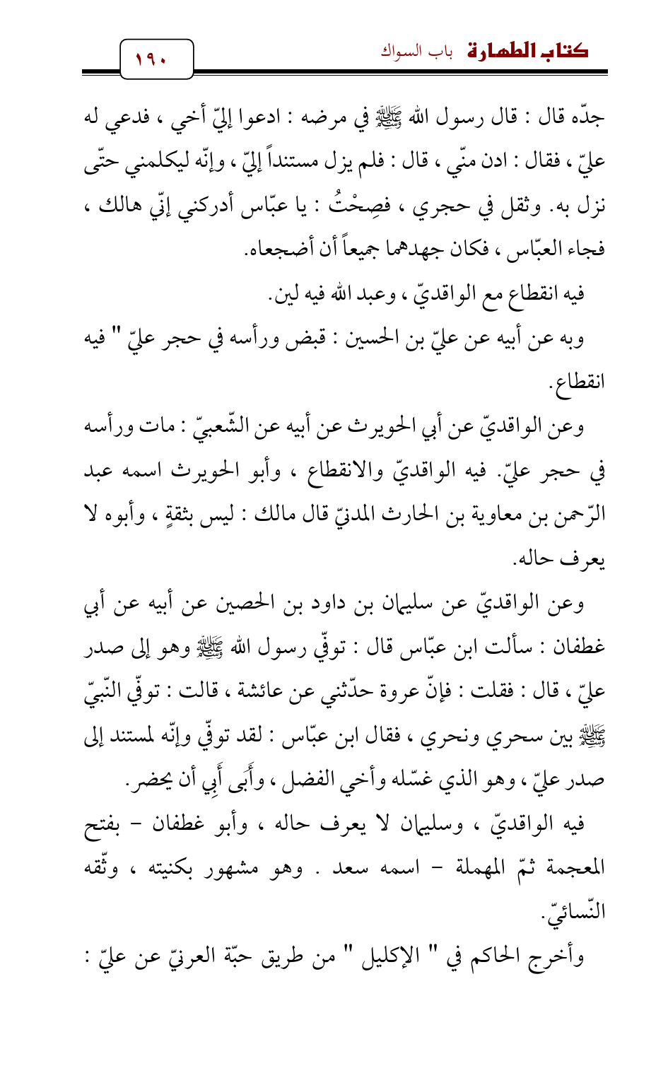 وعن الواقديّ عن سليمان بن داود بن الحصين عن أبيه عن أبي غطفان: سألت ابن عبّاس قال: توفّي رسول الله - صلى الله عليه وسلم - وهو إلى صدر عليّ، قال: فقلت: فإنّ عروة حدّثني عن عائشة , قالت: توفّي النّبيّ - صلى الله عليه وسلم - بين سحري ونحري، فقال ابن عبّاس: لقد توفّي وإنّه لمستند إلى صدر عليّ، وهو الذي غسّله وأخي الفضل، وأَبَى أَبِي أن يحضر.