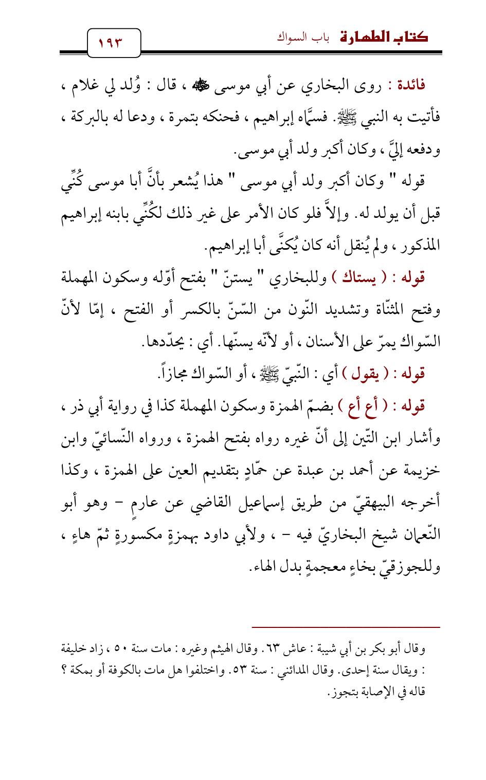 فائدة: روى البخاري عن أبي موسى - رضي الله عنه -، قال: وُلد لي غلام، فأتيت به النبي - صلى الله عليه وسلم -. فسمَّاه إبراهيم، فحنكه بتمرة، ودعا له بالبركة، ودفعه إليَّ، وكان أكبر ولد أبي موسى.