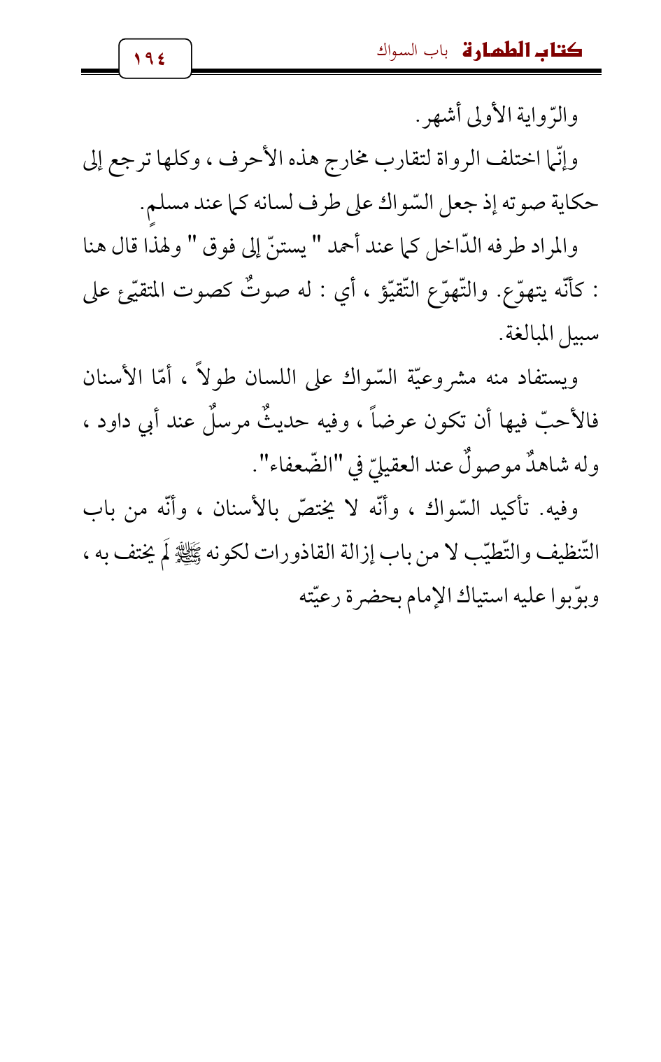 وإنّما اختلف الرواة لتقارب مخارج هذه الأحرف , وكلها ترجع إلى حكاية صوته إذ جعل السّواك على طرف لسانه كما عند مسلمٍ.