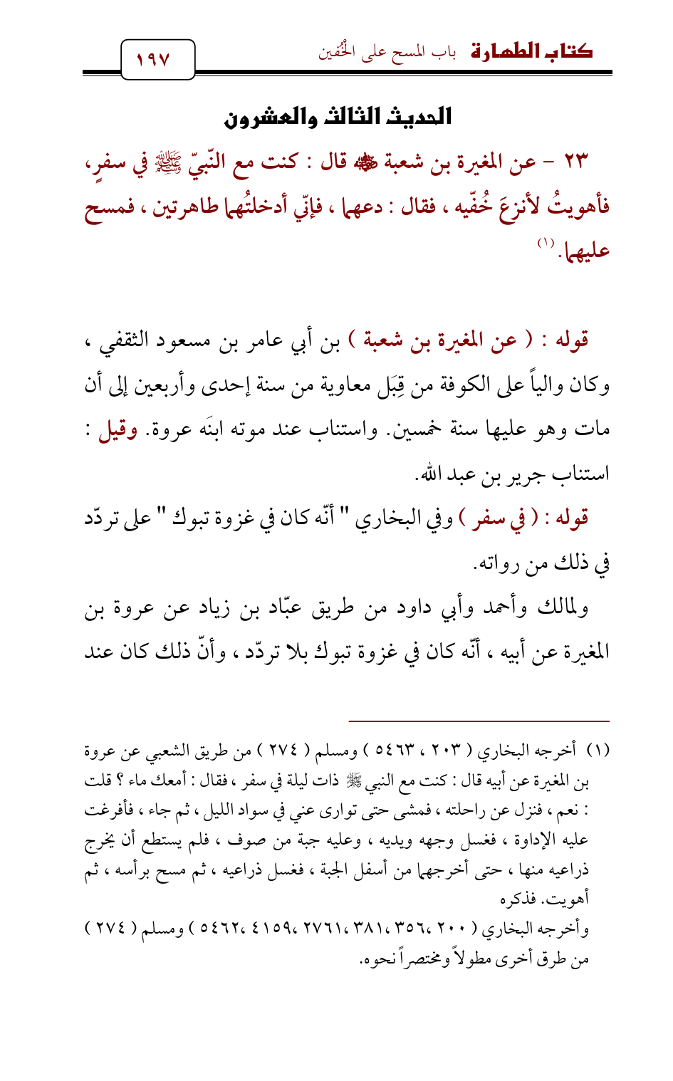 23 - عن المغيرة بن شعبة - رضي الله عنه - قال: كنت مع النّبيّ - صلى الله عليه وسلم - في سفرٍ, فأهويتُ لأنزعَ خُفّيه , فقال: دعهما , فإنّي أدخلتُهما طاهرتين , فمسح عليهما. (¬1)