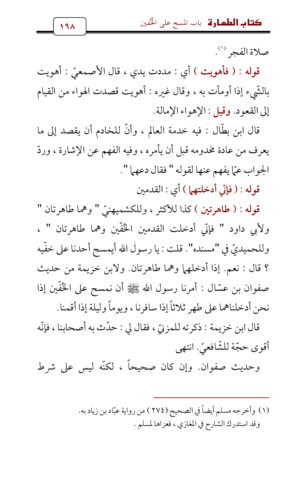 قوله: (طاهرتين) كذا للأكثر، وللكشميهنيّ " وهما طاهرتان " ولأبي داود " فإنّي أدخلت القدمين الخُفّين وهما طاهرتان " , وللحميديّ في " مسنده ". قلت: يا رسولَ الله أيمسح أحدنا على خفّيه؟ قال: نعم. إذا أدخلهما وهما طاهرتان. ولابن خزيمة من حديث صفوان بن عسّال: أمرنا رسول الله - صلى الله عليه وسلم - أن نمسح على الخُفّين إذا نحن أدخلناهما على طهر ثلاثاً إذا سافرنا، ويوماً وليلة إذا أقمنا.