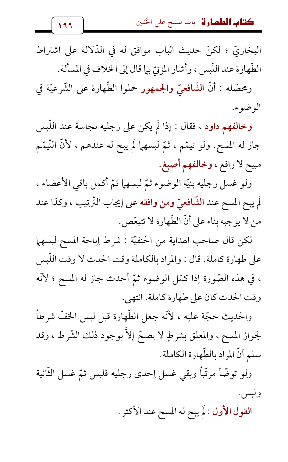 وخالفهم داود , فقال: إذا لَم يكن على رجليه نجاسة عند اللّبس جاز له المسح. ولو تيمّم , ثمّ لبسهما لَم يبح له عندهم , لأنّ التّيمّم مبيح لا رافع، وخالفهم أصبغ.
