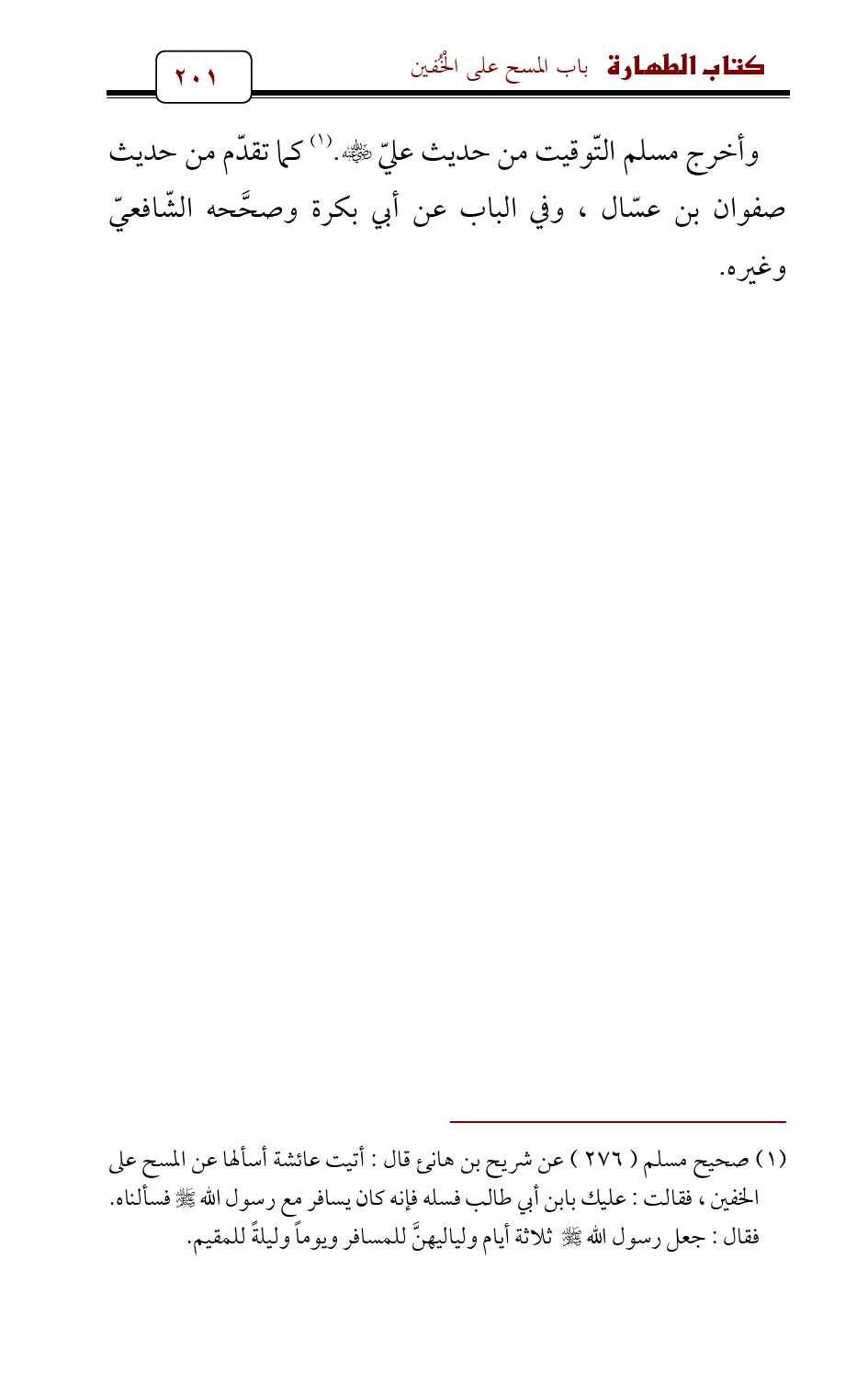 (¬1) صحيح مسلم (276) عن شريح بن هانئ قال: أتيت عائشة أسألها عن المسح على الخفين , فقالت: عليك بابن أبي طالب فسله فإنه كان يسافر مع رسول الله - صلى الله عليه وسلم - فسألناه. فقال: جعل رسول الله - صلى الله عليه وسلم - ثلاثة أيام ولياليهنَّ للمسافر ويوماً وليلةً للمقيم.