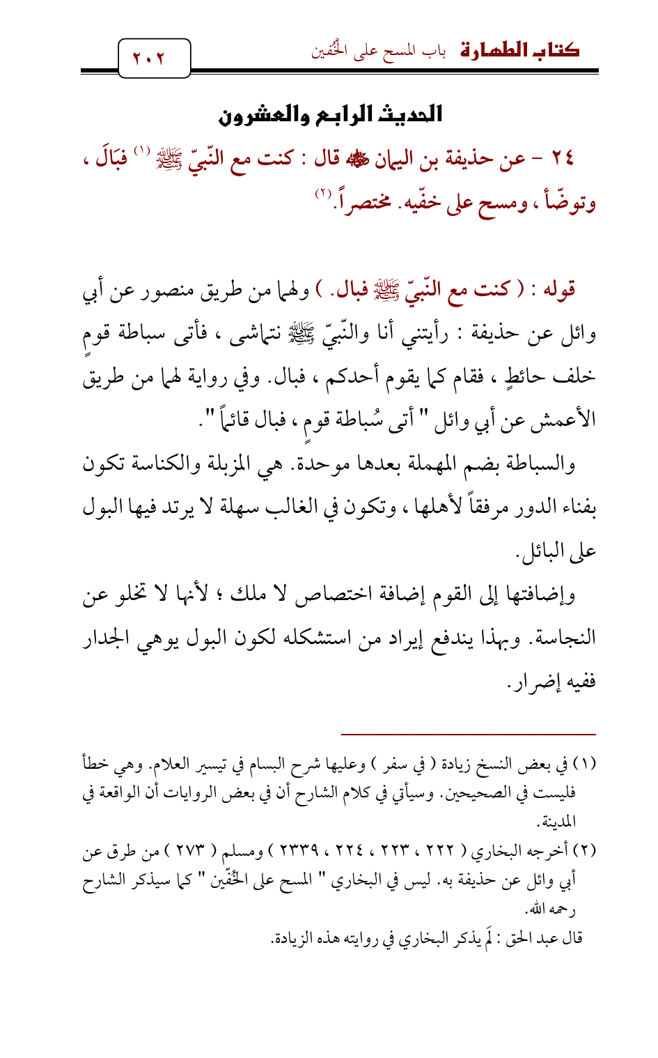 (¬2) أخرجه البخاري (222 , 223 , 224 , 2339) ومسلم (273) من طرق عن أبي وائل عن حذيفة به. ليس في البخاري " المسح على الخُفّين " كما سيذكر الشارح رحمه الله.