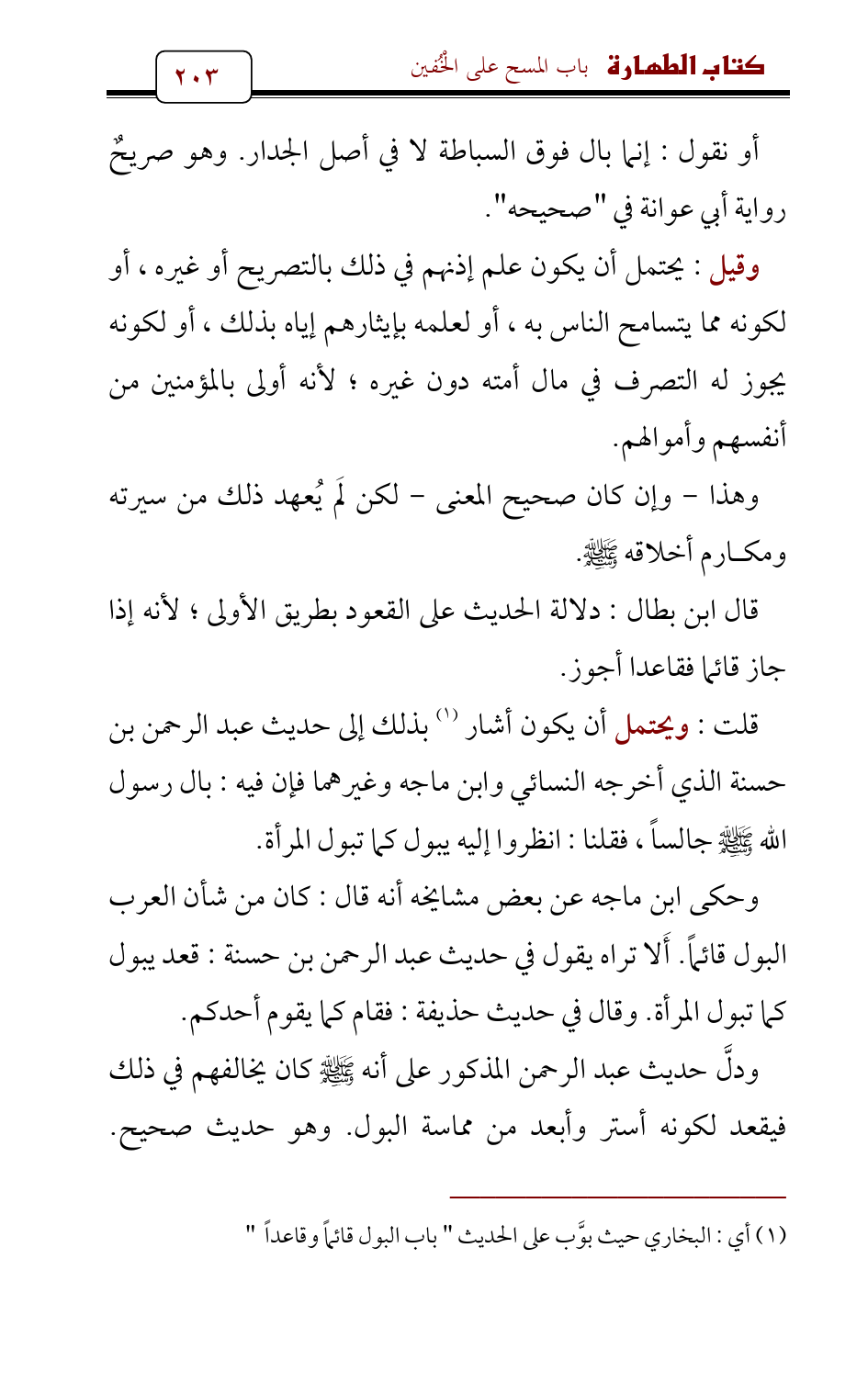 وحكى ابن ماجه عن بعض مشايخه أنه قال: كان من شأن العرب البول قائماً. أَلا تراه يقول في حديث عبد الرحمن بن حسنة: قعد يبول كما تبول المرأة. وقال في حديث حذيفة: فقام كما يقوم أحدكم.