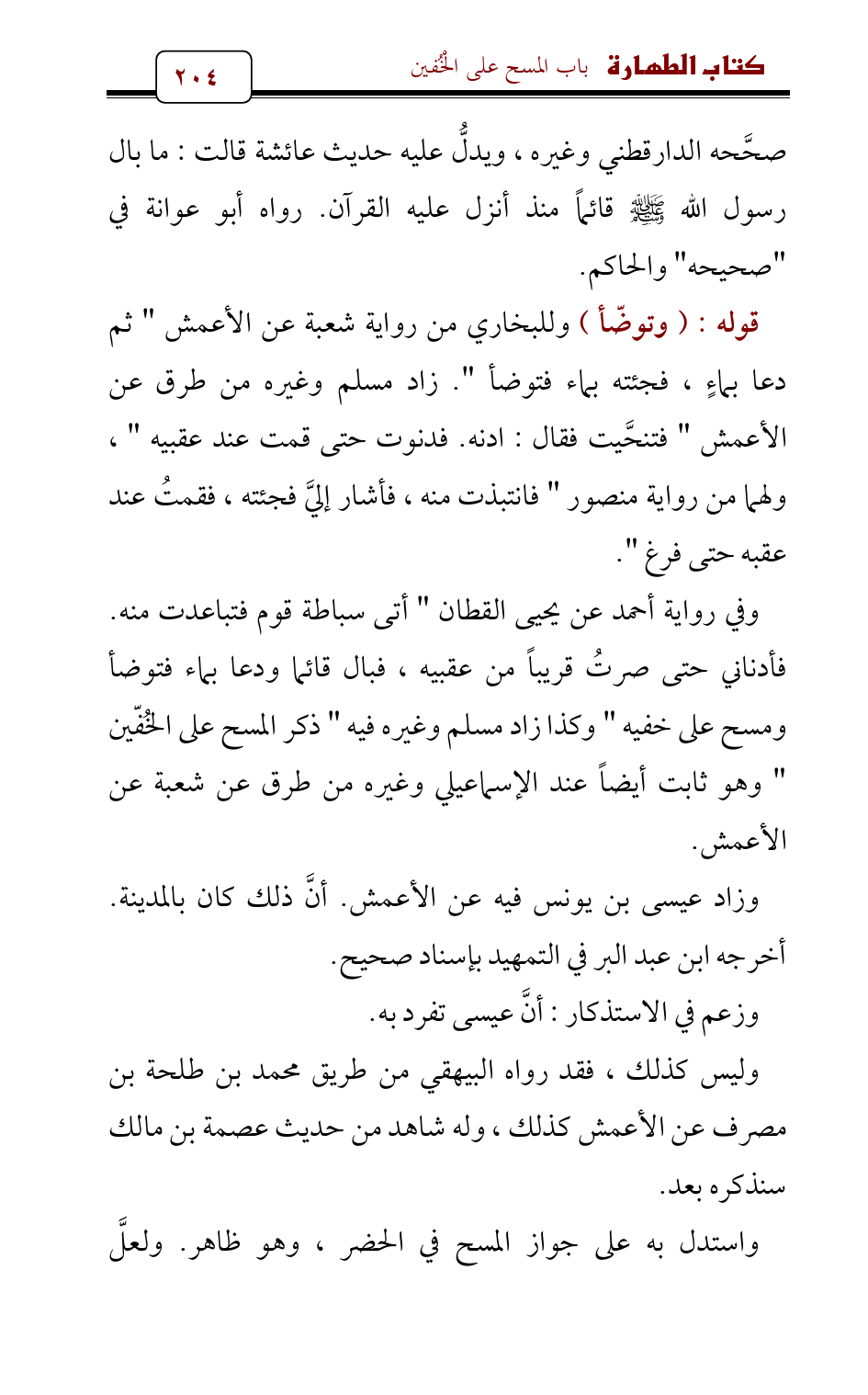 وفي رواية أحمد عن يحيى القطان " أتى سباطة قوم فتباعدت منه. فأدناني حتى صرتُ قريباً من عقبيه , فبال قائما ودعا بماء فتوضأ ومسح على خفيه " وكذا زاد مسلم وغيره فيه " ذكر المسح على الخُفّين " وهو ثابت أيضاً عند الإسماعيلي وغيره من طرق عن شعبة عن الأعمش.