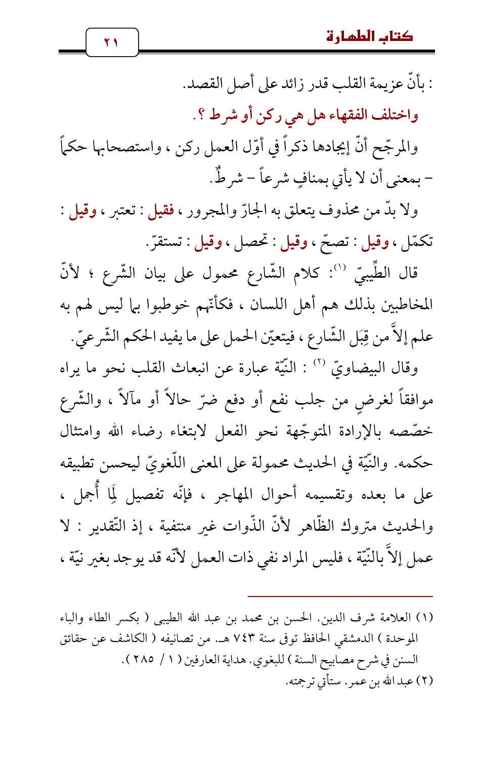 (¬1) العلامة شرف الدين. الحسن بن محمد بن عبد الله الطيبى (بكسر الطاء والباء الموحدة) الدمشقي الحافظ توفى سنة 743 هـ. من تصانيفه (الكاشف عن حقائق السنن في شرح مصابيح السنة) للبغوي. هداية العارفين (1/ 285).