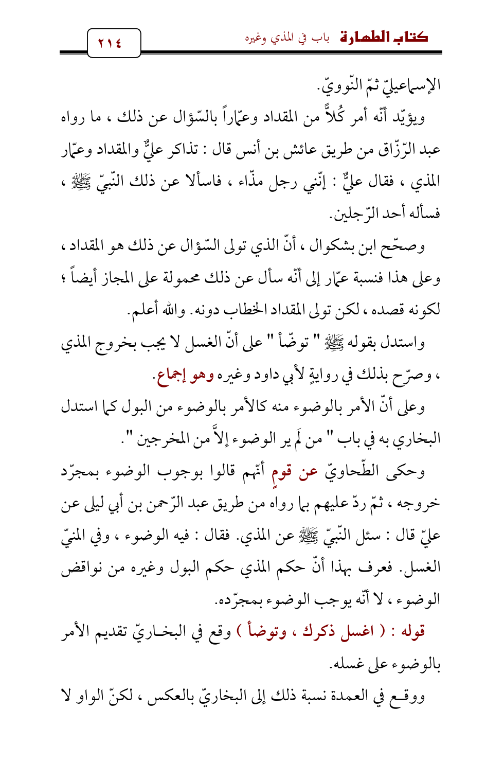 وحكى الطّحاويّ عن قومٍ أنّهم قالوا بوجوب الوضوء بمجرّد خروجه , ثمّ ردّ عليهم بما رواه من طريق عبد الرّحمن بن أبي ليلى عن عليّ قال: سئل النّبيّ - صلى الله عليه وسلم - عن المذي. فقال: فيه الوضوء , وفي المنيّ الغسل. فعرف بهذا أنّ حكم المذي حكم البول وغيره من نواقض الوضوء , لا أنّه يوجب الوضوء بمجرّده.