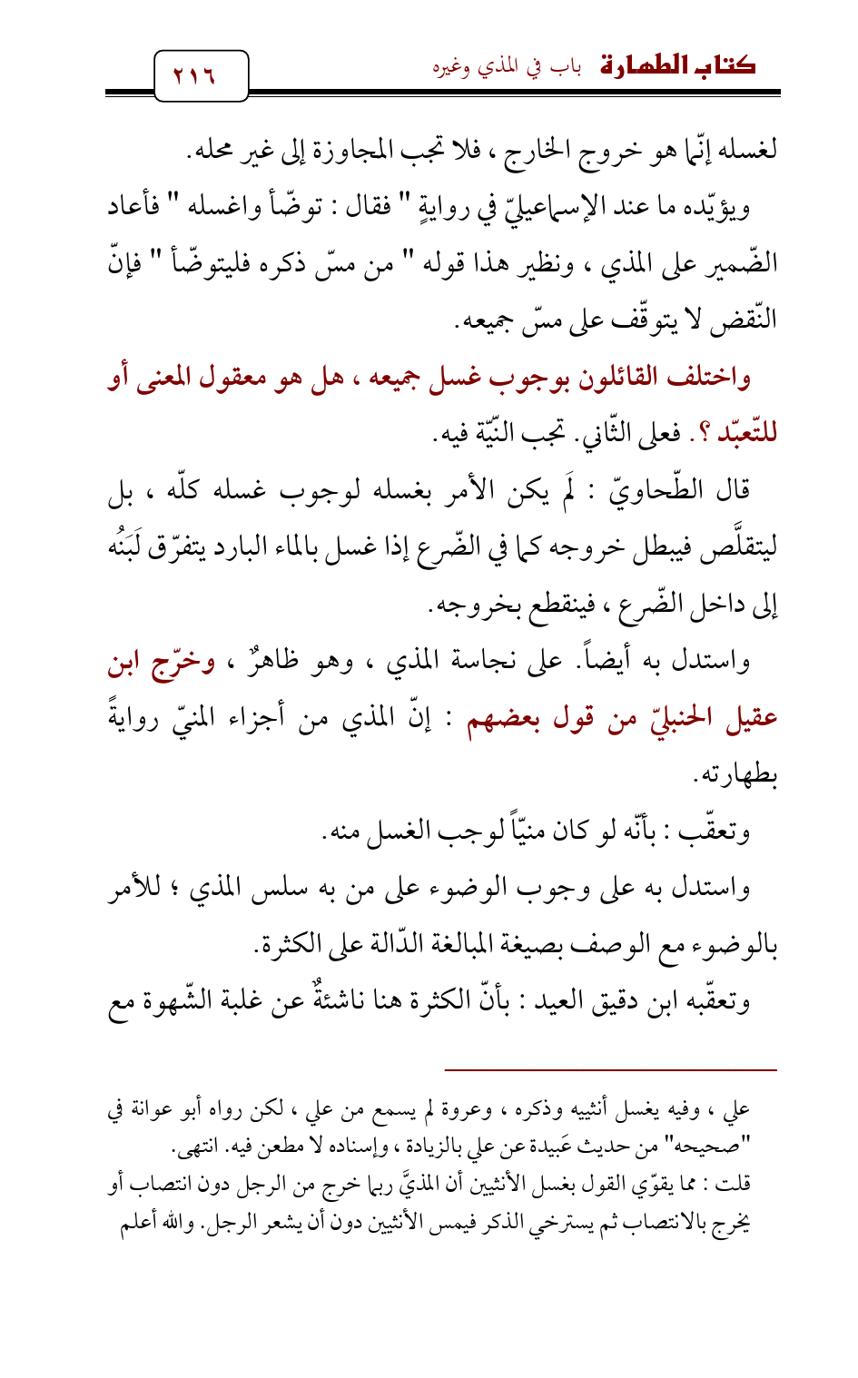 واستدل به أيضاً. على نجاسة المذي , وهو ظاهرٌ , وخرّج ابن عقيل الحنبليّ من قول بعضهم: إنّ المذي من أجزاء المنيّ روايةً بطهارته.