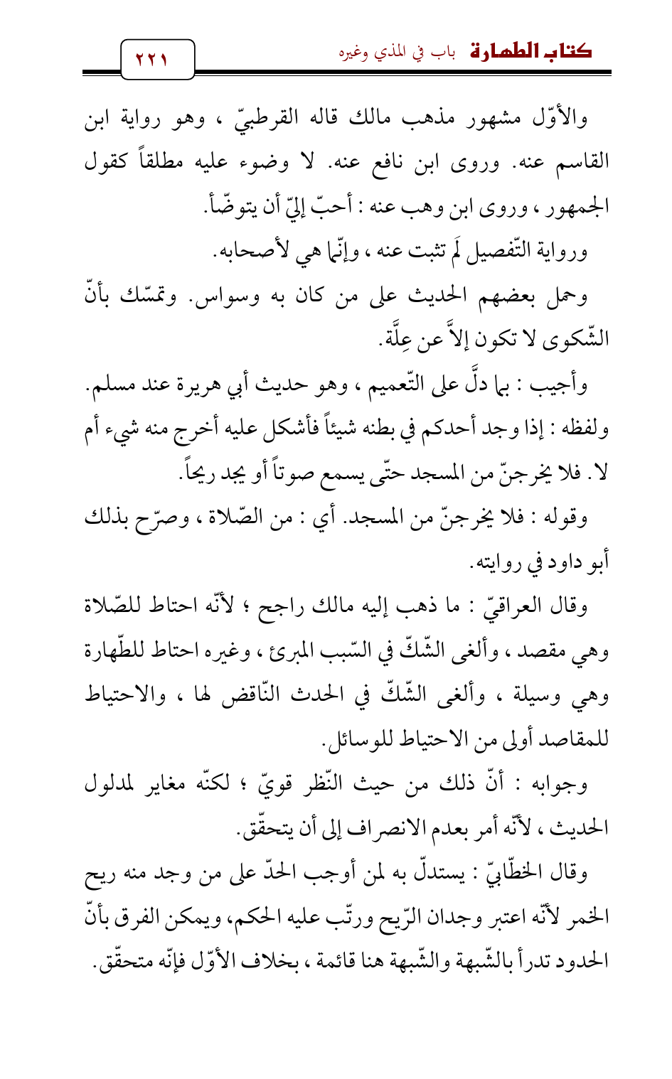 وقال العراقيّ: ما ذهب إليه مالك راجح؛ لأنّه احتاط للصّلاة وهي مقصد، وألغى الشّكّ في السّبب المبرئ، وغيره احتاط للطّهارة وهي وسيلة , وألغى الشّكّ في الحدث النّاقض لها، والاحتياط للمقاصد أولى من الاحتياط للوسائل.