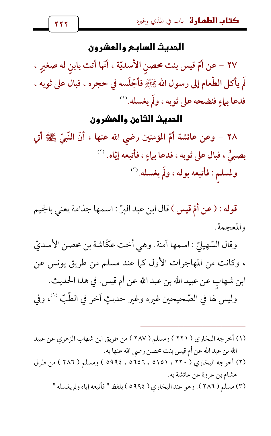 27 - عن أمّ قيس بنت محصنٍ الأسديّة , أنّها أتت بابنٍ له صغيرٍ , لَم يأكل الطّعام إلى رسول الله - صلى الله عليه وسلم - فأجْلَسه في حجره , فبال على ثوبه , فدعا بماءٍ فنضحه على ثوبه , ولَم يغسله. (¬1)