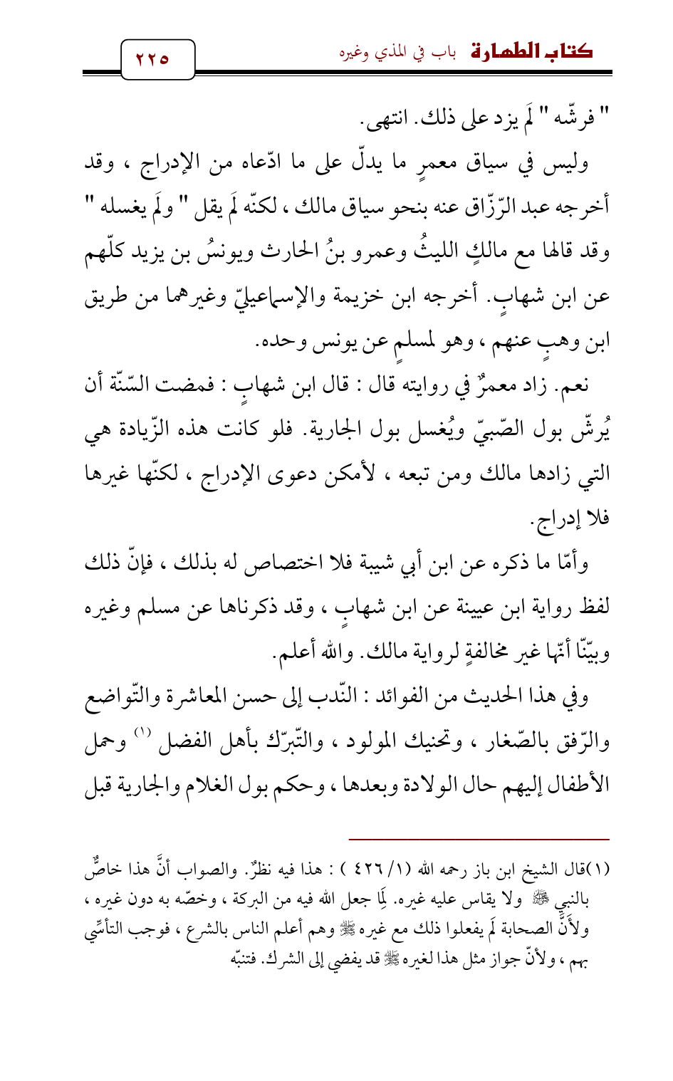 نعم. زاد معمرٌ في روايته قال: قال ابن شهابٍ: فمضت السّنّة أن يُرشّ بول الصّبيّ ويُغسل بول الجارية. فلو كانت هذه الزّيادة هي التي زادها مالك ومن تبعه , لأمكن دعوى الإدراج , لكنّها غيرها فلا إدراج.
