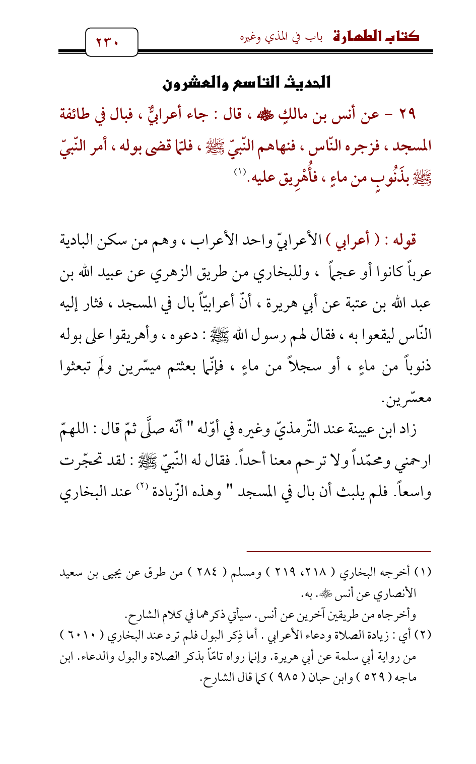 29 - عن أنس بن مالكٍ - رضي الله عنه - , قال: جاء أعرابيٌّ , فبال في طائفة المسجد , فزجره النّاس , فنهاهم النّبيّ - صلى الله عليه وسلم - , فلمّا قضى بوله , أمر النّبيّ - صلى الله عليه وسلم - بذَنُوبٍ من ماءٍ , فأُهْرِيق عليه. (¬1)