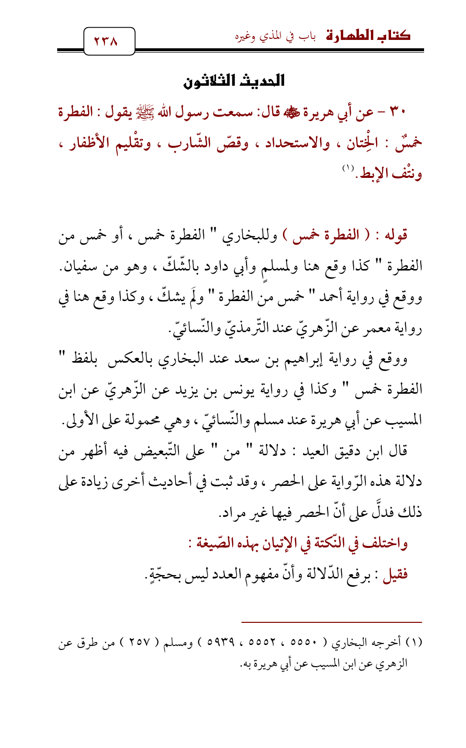 30 - عن أبي هريرة - رضي الله عنه - قال: سمعت رسول الله - صلى الله عليه وسلم - يقول: الفطرة خمسٌ: الْخِتان , والاستحداد , وقصّ الشّارب , وتقْليم الأظفار , ونتْف الإبط. (¬1)