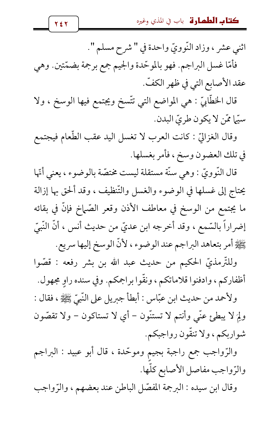فأمّا غسل البراجم. فهو بالموحّدة والجيم جمع برجمة بضمّتين. وهي عقد الأصابع التي في ظهر الكفّ.