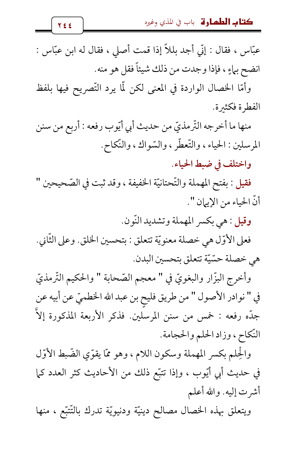 عبّاس , فقال: إنّي أجد بللاً إذا قمت أصلي، فقال له ابن عبّاس: انضح بماءٍ، فإذا وجدت من ذلك شيئاً فقل هو منه.