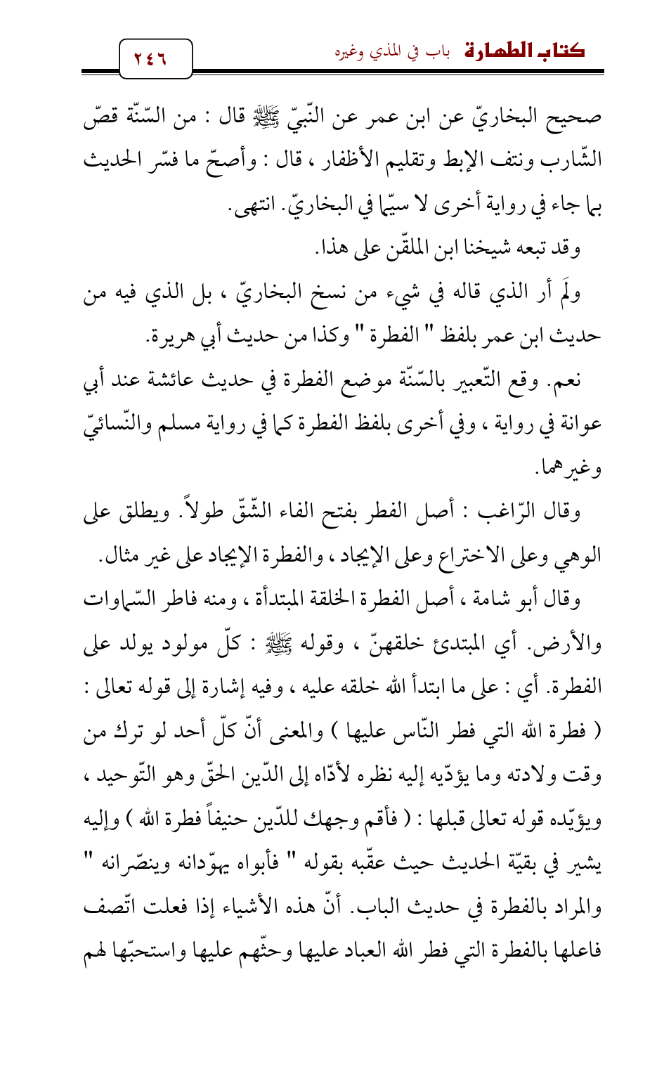 وقال أبو شامة، أصل الفطرة الخلقة المبتدأة، ومنه فاطر السّماوات والأرض. أي المبتدئ خلقهنّ، وقوله - صلى الله عليه وسلم -: كلّ مولود يولد على الفطرة. أي: على ما ابتدأ الله خلقه عليه، وفيه إشارة إلى قوله تعالى: (فطرة الله التي فطر النّاس عليها) والمعنى أنّ كلّ أحد لو ترك من وقت ولادته وما يؤدّيه إليه نظره لأدّاه إلى الدّين الحقّ وهو التّوحيد، ويؤيّده قوله تعالى قبلها: (فأقم وجهك للدّين حنيفاً فطرة الله) وإليه يشير في بقيّة الحديث حيث عقّبه بقوله " فأبواه يهوّدانه وينصّرانه " والمراد بالفطرة في حديث الباب. أنّ هذه الأشياء إذا فعلت اتّصف فاعلها بالفطرة التي فطر الله العباد عليها وحثّهم عليها واستحبّها لهم