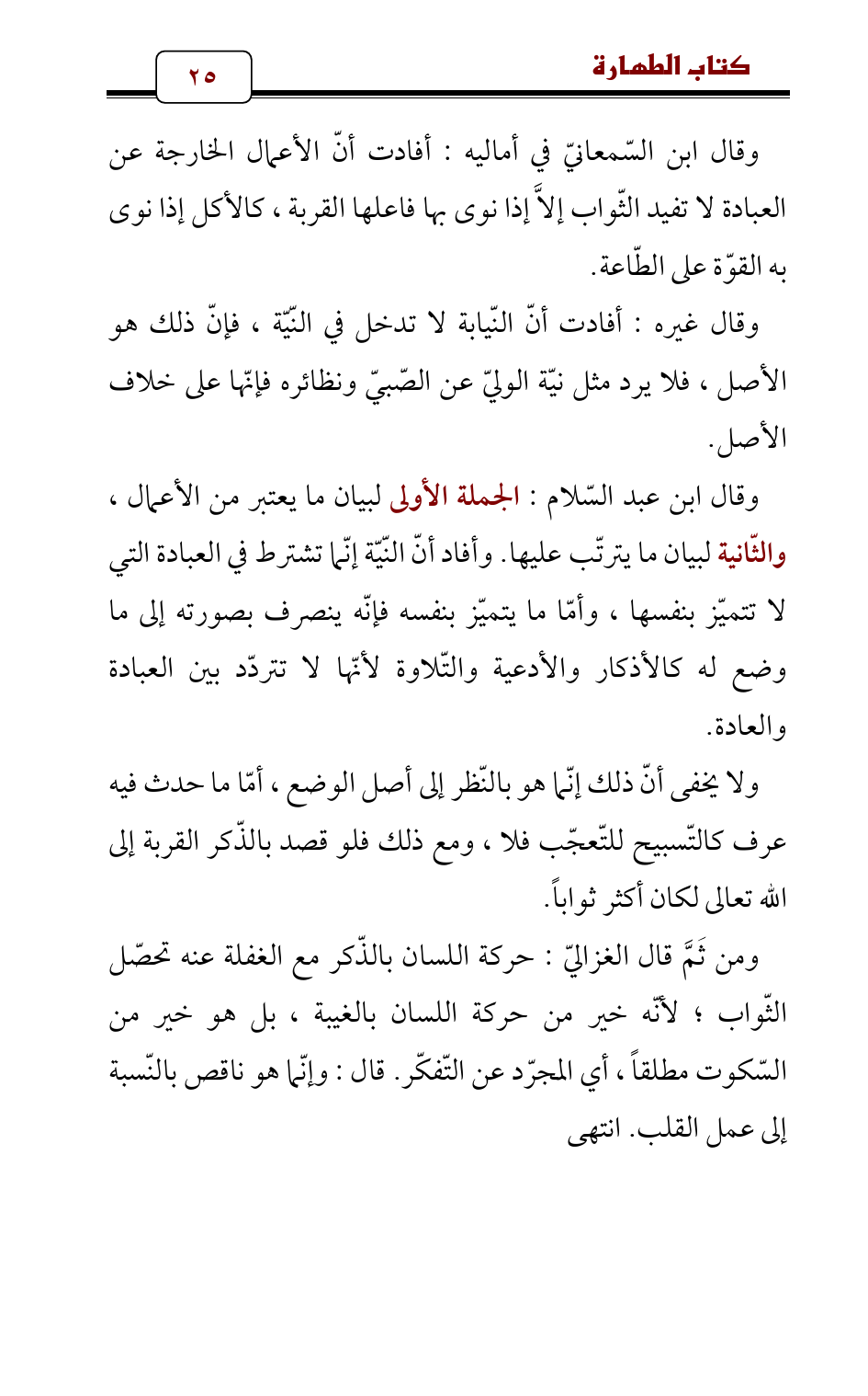 وقال ابن عبد السّلام: الجملة الأولى لبيان ما يعتبر من الأعمال، والثّانية لبيان ما يترتّب عليها. وأفاد أنّ النّيّة إنّما تشترط في العبادة التي لا تتميّز بنفسها، وأمّا ما يتميّز بنفسه فإنّه ينصرف بصورته إلى ما وضع له كالأذكار والأدعية والتّلاوة لأنّها لا تتردّد بين العبادة والعادة.