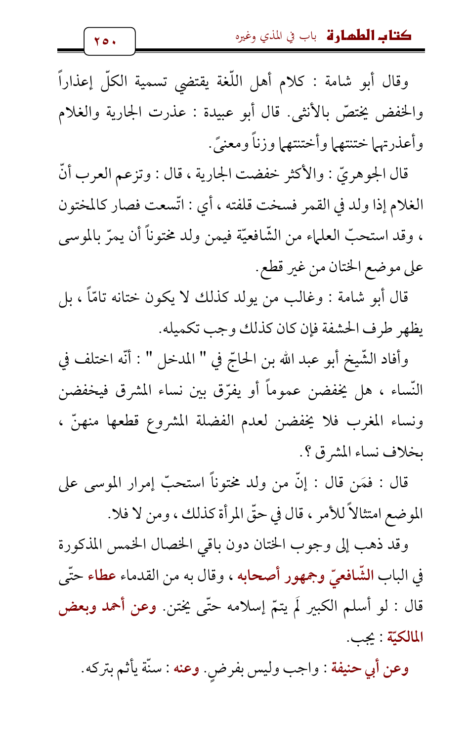 وقال أبو شامة: كلام أهل اللّغة يقتضي تسمية الكلّ إعذاراً والخفض يختصّ بالأنثى. قال أبو عبيدة: عذرت الجارية والغلام وأعذرتهما ختنتهما وأختنتهما وزناً ومعنىً.