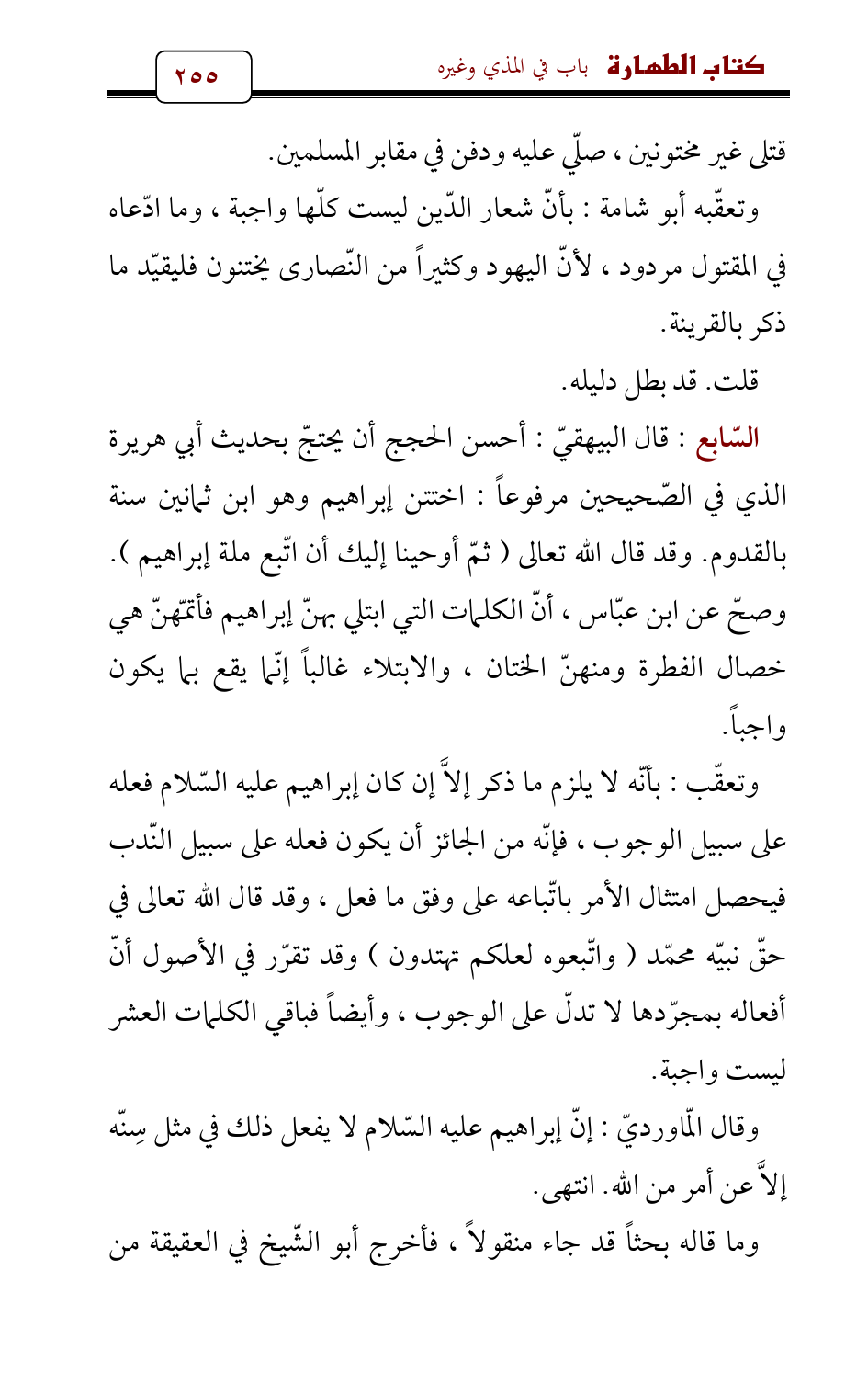 وتعقّبه أبو شامة: بأنّ شعار الدّين ليست كلّها واجبة، وما ادّعاه في المقتول مردود , لأنّ اليهود وكثيراً من النّصارى يختنون فليقيّد ما ذكر بالقرينة.
