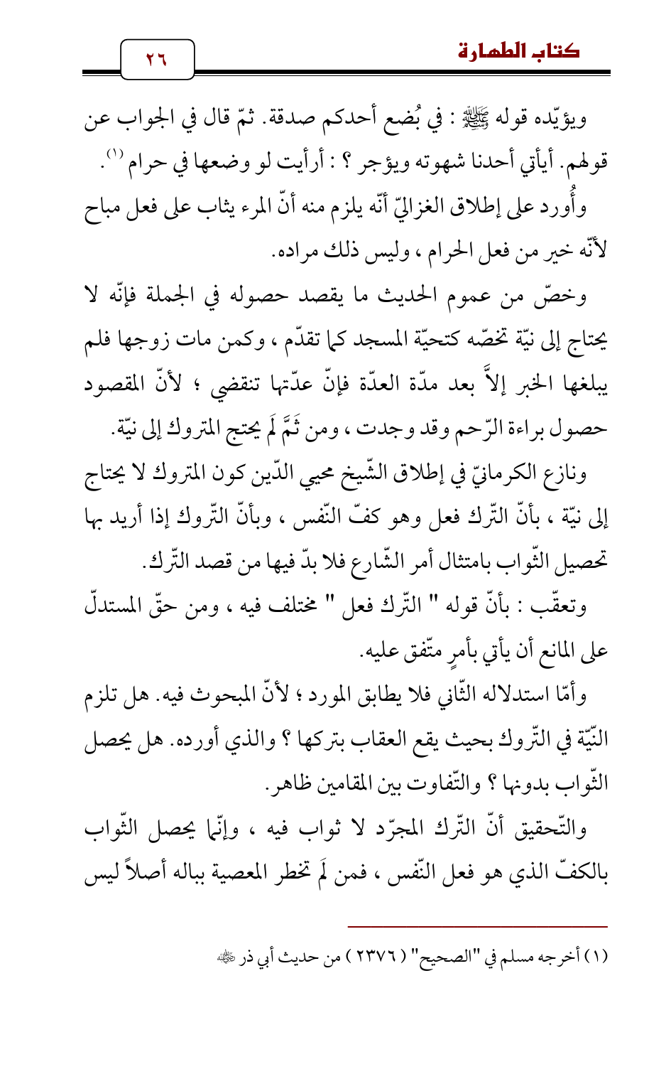 ويؤيّده قوله - صلى الله عليه وسلم -: في بُضع أحدكم صدقة. ثمّ قال في الجواب عن قولهم. أيأتي أحدنا شهوته ويؤجر؟: أرأيت لو وضعها في حرام (¬1).