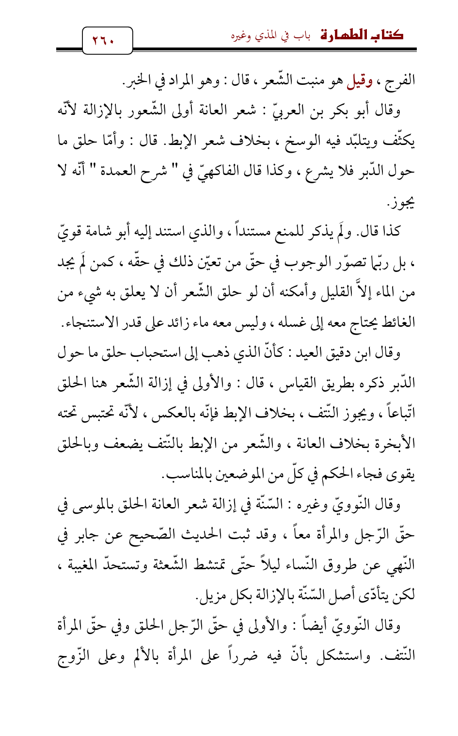 وقال أبو بكر بن العربيّ: شعر العانة أولى الشّعور بالإزالة لأنّه يكثّف ويتلبّد فيه الوسخ، بخلاف شعر الإبط. قال: وأمّا حلق ما حول الدّبر فلا يشرع، وكذا قال الفاكهيّ في " شرح العمدة " أنّه لا يجوز.