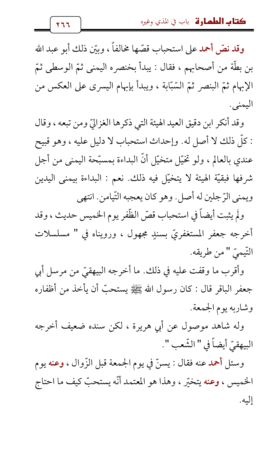 وأقرب ما وقفت عليه في ذلك. ما أخرجه البيهقيّ من مرسل أبي جعفر الباقر قال: كان رسول الله - صلى الله عليه وسلم - يستحبّ أن يأخذ من أظفاره وشاربه يوم الجمعة.