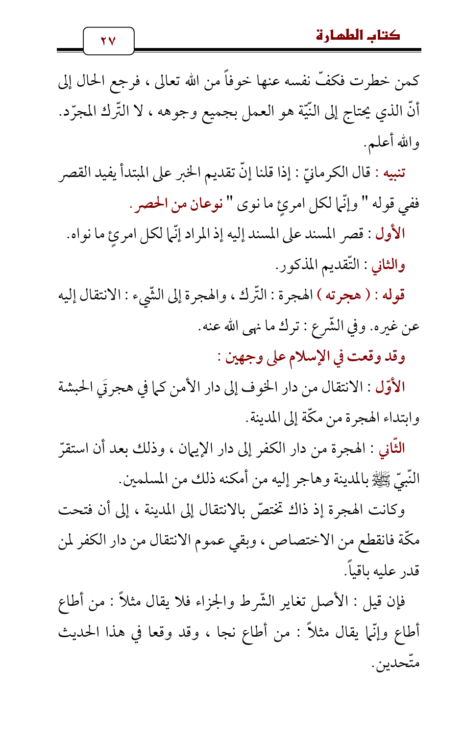 تنبيه: قال الكرمانيّ: إذا قلنا إنّ تقديم الخبر على المبتدأ يفيد القصر ففي قوله " وإنّما لكل امرئٍ ما نوى " نوعان من الحصر.