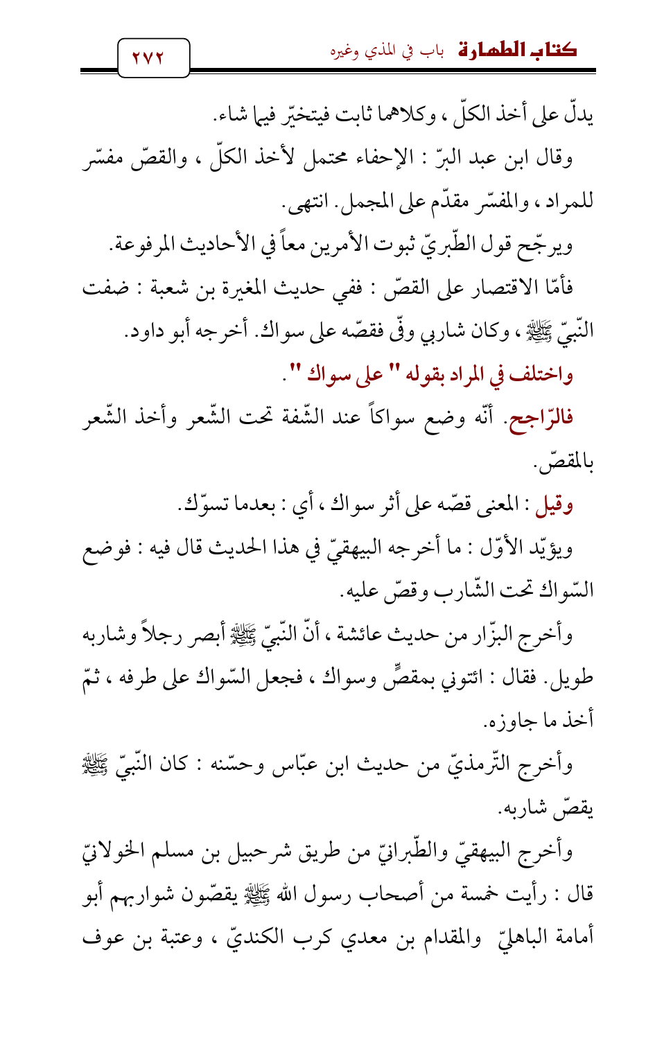 وأخرج البزّار من حديث عائشة , أنّ النّبيّ - صلى الله عليه وسلم - أبصر رجلاً وشاربه طويل. فقال: ائتوني بمقصٍّ وسواك، فجعل السّواك على طرفه , ثمّ أخذ ما جاوزه.