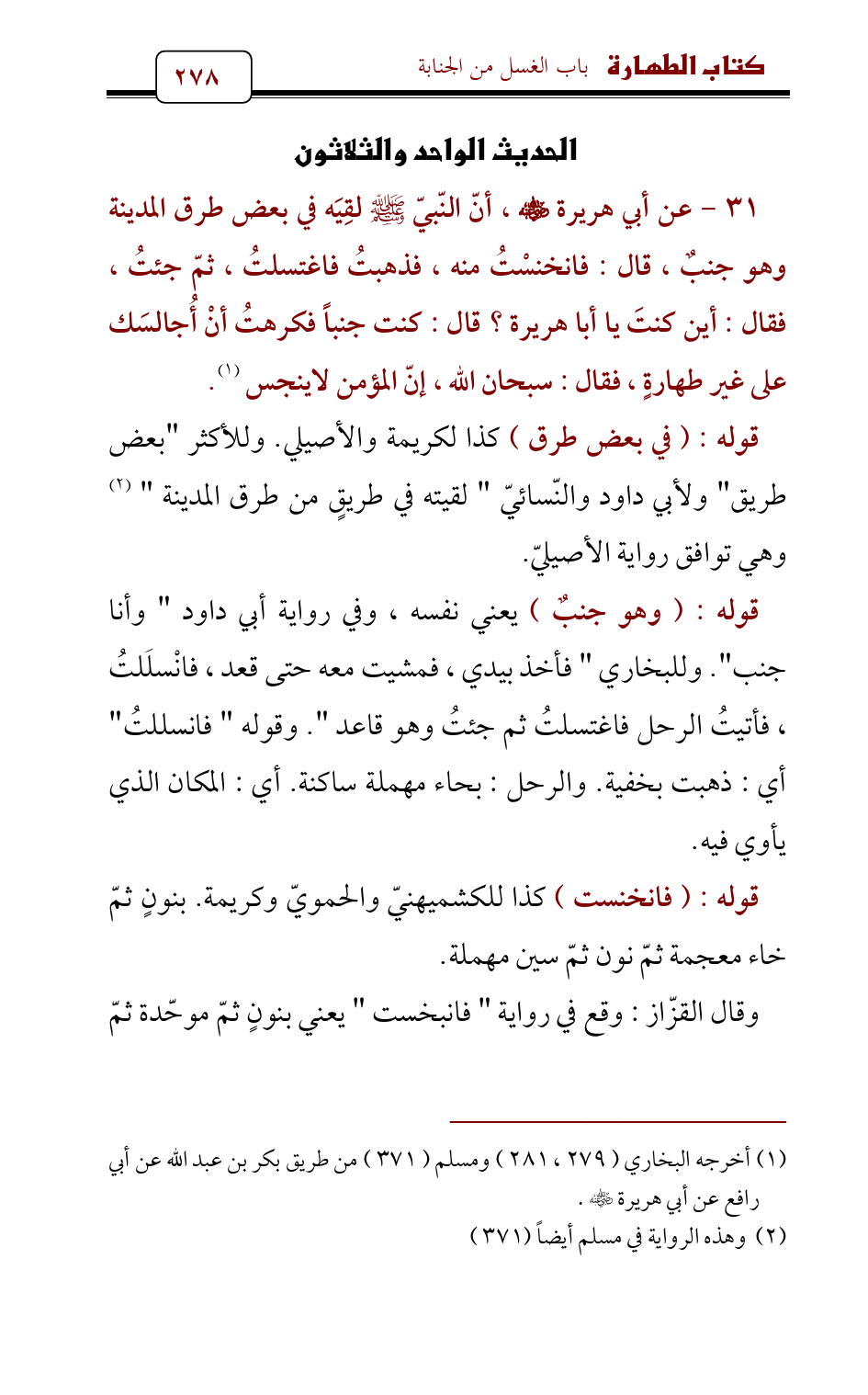 31 - عن أبي هريرة - رضي الله عنه - , أنّ النّبيّ - صلى الله عليه وسلم - لقِيَه في بعض طرق المدينة وهو جنبٌ، قال: فانخنسْتُ منه، فذهبتُ فاغتسلتُ , ثمّ جئتُ، فقال: أين كنتَ يا أبا هريرة؟ قال: كنت جنباً فكرهتُ أنْ أُجالسَك على غير طهارةٍ، فقال: سبحان الله، إنّ المؤمن لاينجس (¬1).