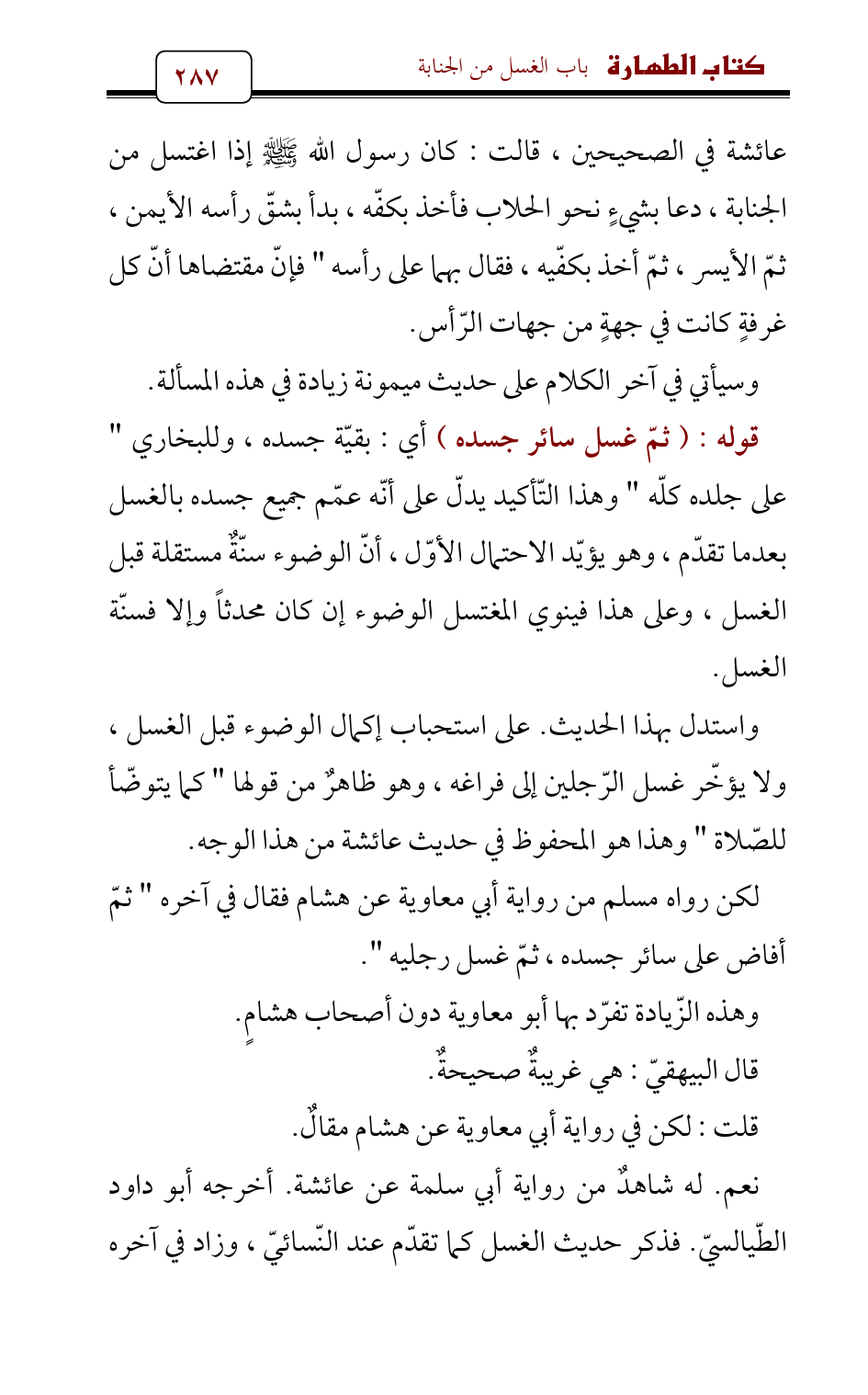 لكن رواه مسلم من رواية أبي معاوية عن هشام فقال في آخره " ثمّ أفاض على سائر جسده , ثمّ غسل رجليه ".